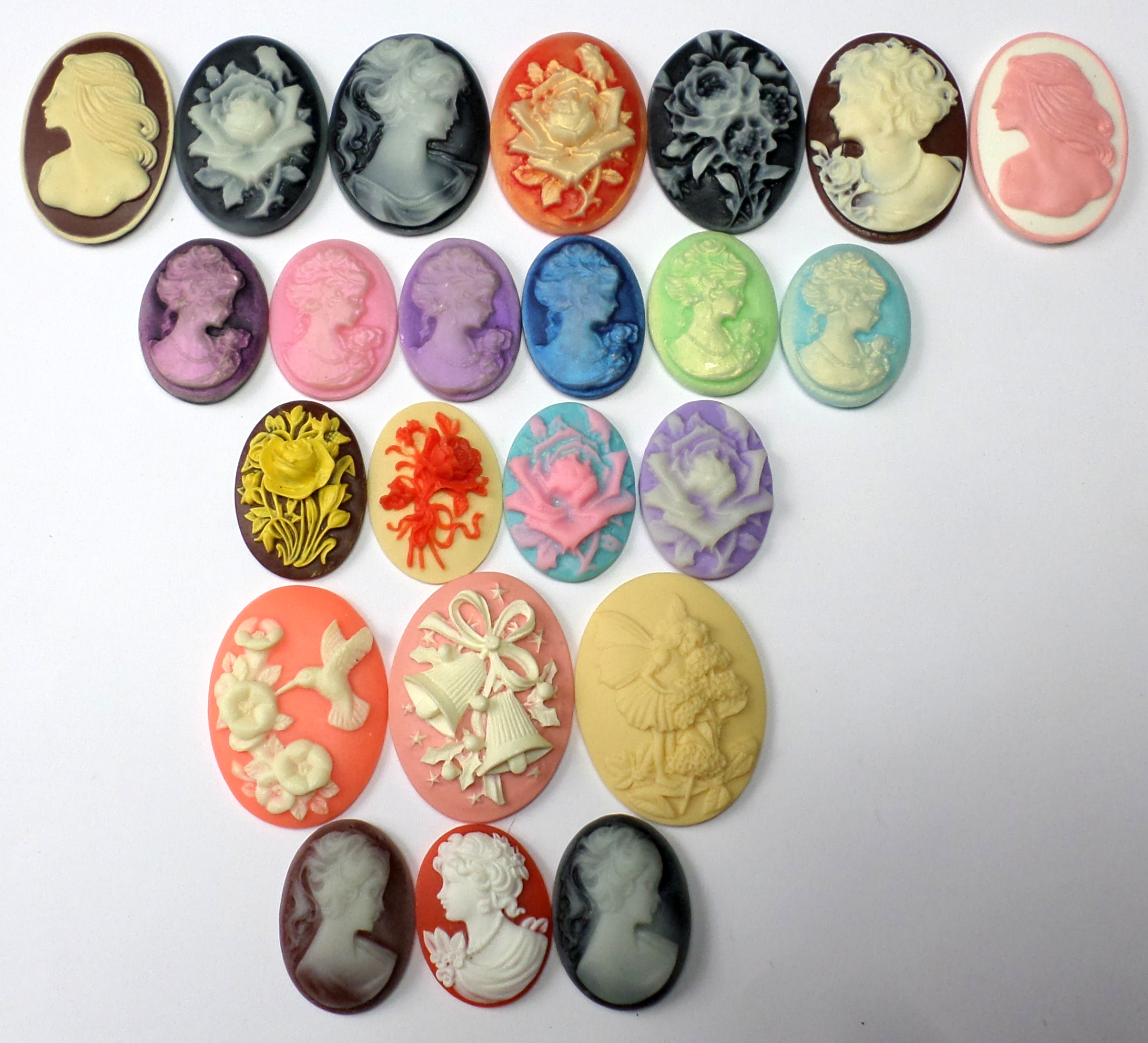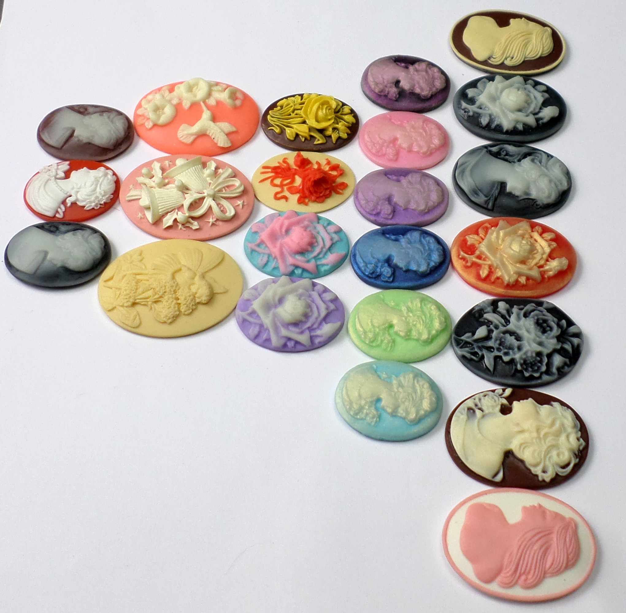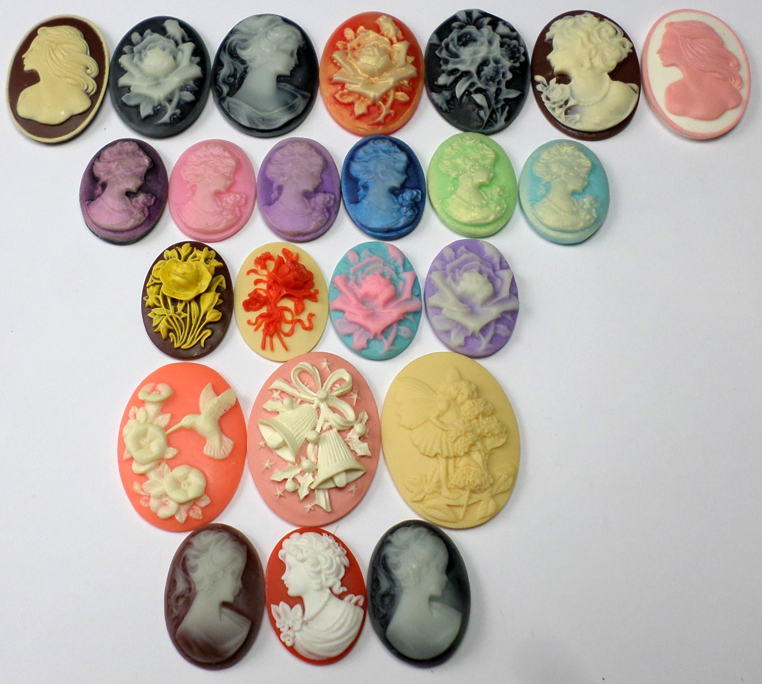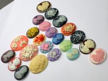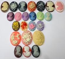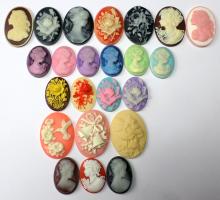 This set includes 23 distinct vintage cameos in a variety of colors, shapes, and styles. Sizes range from 40×30 mm down to 27×21 mm, making them perfect for a wide range of jewelry creations. Each cameo features raised floral accents that give it a lovely 3-D effect, along with finely detailed profiles and beautiful color contrasts. These cameos can be used vertically or horizontally and are easy to adapt to your projects—simply center them in larger settings or gently file them to fit smaller ones. Explore my other listings for coordinating bails, bracelets, chains, connectors, jump rings, lockets, pendants, pins, rings, and settings to complete your designs.