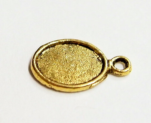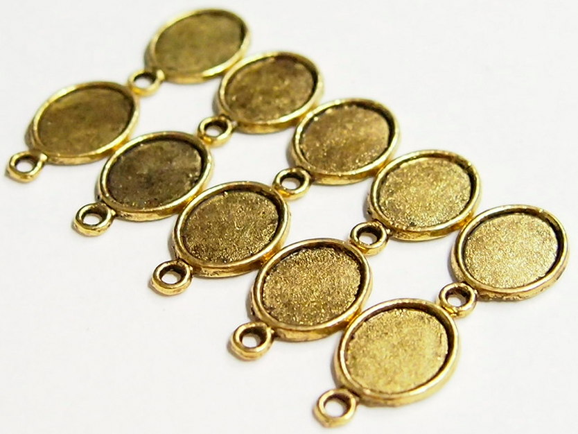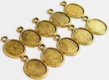 You are buying 10 of 10 mm x 8 mm Antique Gold Plated Earring or Charm Pendant Settings, the Back has a tiny Cross made into it. These can be used as a pendant, earrings, or charms for your bracelet. They are Glue in settings, no prongs. You can put a jump ring (which I have 3 Colors & 2 Sizes of) to make these into a small pendant or charm or make earrings out of them. These have never been used. These are made for 10 mm x 8 mm Cameos or Cabs. Since they are a solid back, you could go down in size a little if you had an odd size cameo or cab to try & fit. I have lots of Great Bails, Bracelets, Cameos, Chains, Connectors, Jump Rings, Lockets, Pendants, Pins, Rings & Settings so, just look at all my listings. I have these in 3 other Colors & in a group of 4 Colors as shown in the last picture item #110911242488. I have lots of great 10x8 mm flower Cameos that look great in these.