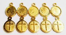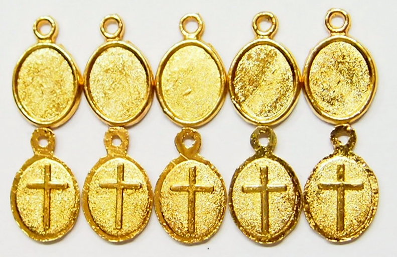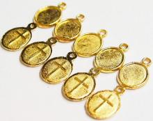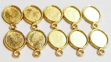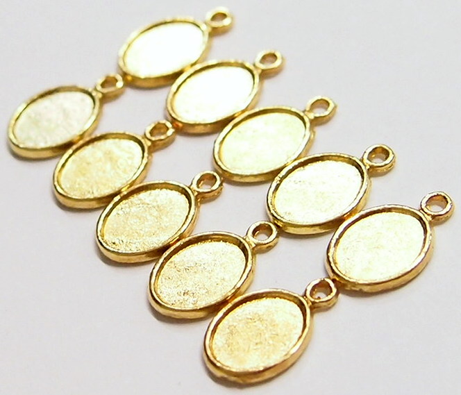 You are buying 10 of 10 mm x 8 mm Gold Plated Pendant/Charm, Earring Settings. These can be used as a pendant, or earrings, or charms for your bracelet or whatever you want. These are Glue in settings, no prongs. You can put a jump ring to make it a small pendant or to make earrings out of them. These have never been used. Since they are a solid back, you could go down in size a little if you had an odd size cameo or cab to try & fit. I have lots of Great Bails, Bracelets, Cameos, Chains, Connectors, Jump Rings, Lockets, Pendants, Pins, Rings & Settings so, just look at all my listings. I have these in 3 other Colors & in a group of 4 Colors (with 2 of each Color) as shown in the last picture.