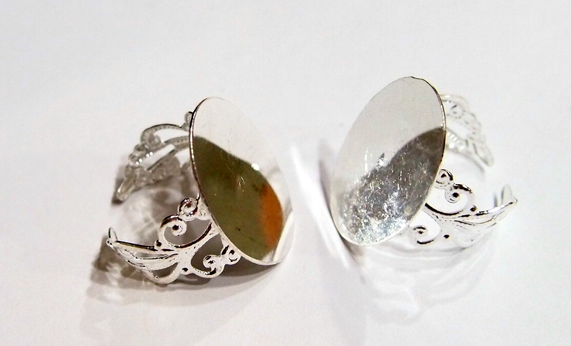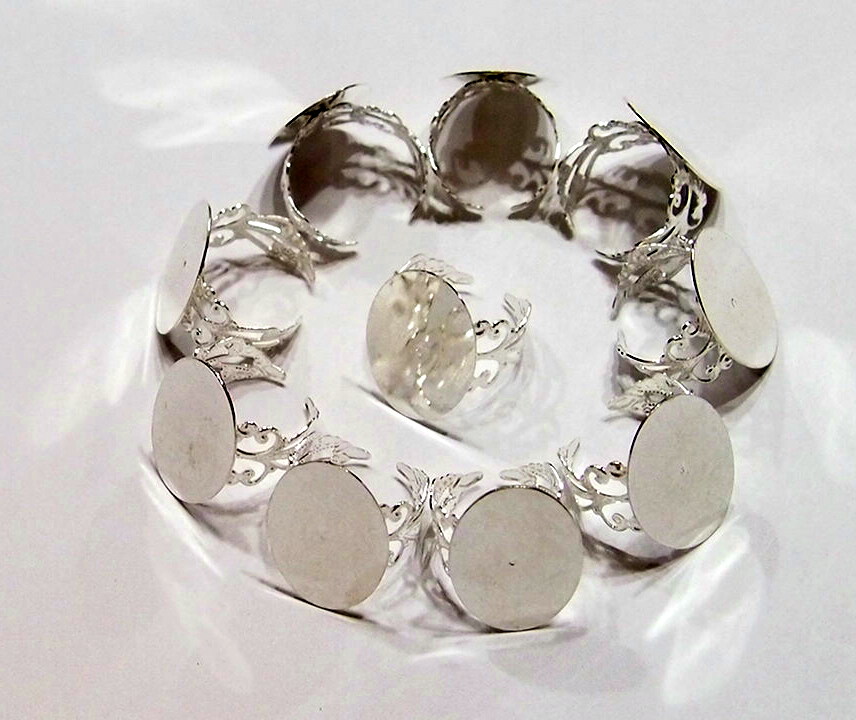 You are buying 10 of 25 mm x 18 mm Silver Plated Victorian Style Adjustable Rings. These are great in that you can put whatever size cameos or cabs you want on them. The face is flat measuring 25 mm x 18 mm so, no restrictions to the size you can put on these. They have a very ornate Victorian style scroll to them. These are an adjustable size & lightweight ring. These will work great with any cameos or cabs. They will have to be glued on. I have lots of Great Bails, Bracelets, Cameos, Chains, Connectors, Jump Rings, Lockets, Pendants, Pins, Rings & Settings so, just look at all my listings. I have these in 3 other Colors & in a group of 4 Colors as shown in the last pictures. I also have these in 4 colors in 18x13 mm and several other styles of adjustable rings. .