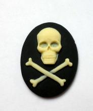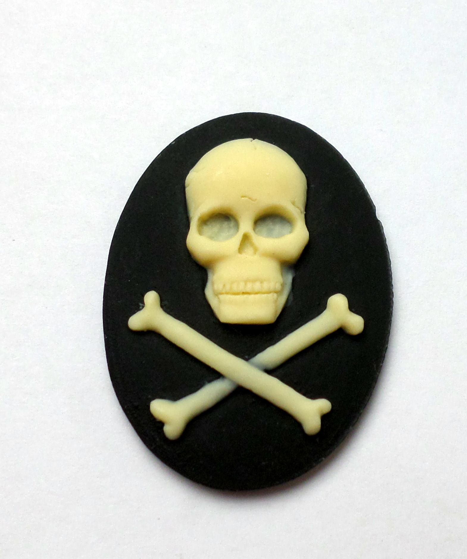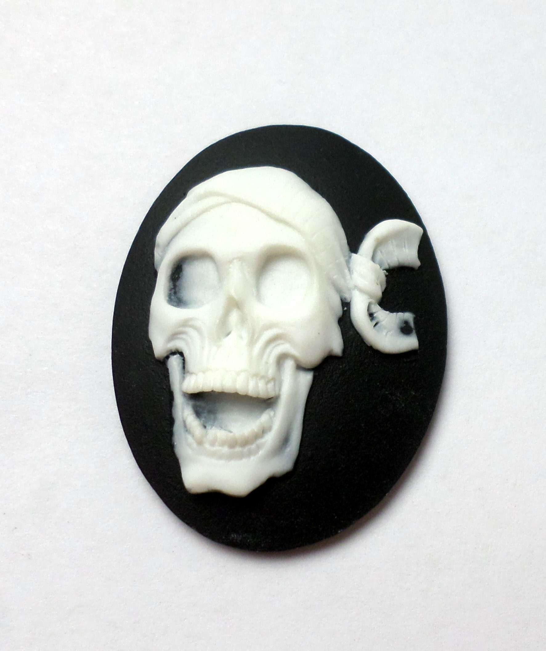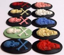 You are buying 10 different Colors of 40 mm x 30 mm Skull & Crossbones/Pirates Cameos. These are a mixed set of Skull and Crossbones & Pirate Cameos in several different color schemes. Exactly what you see is what you will receive. These are very detailed and all my cameos have never been used. The molding process of these are just great, no flaws. These are pretty fabulous. They measure 40 mm x 30 mm. I have lots of Great Bails, Bracelets, Cameos, Chains, Connectors, Jump Rings, Lockets, Pendants, Pins, Rings & Settings so, just look at all my listings. All of these are offered in groups of 4 of each Color. Starting on the top row left to right is the blue over black item #110911243295, white over sage green item #455641052580, pink over black item #110930807374, cream over black item #360471675600, and red over black item #698771556591. Bottom row is the red over black skull head with bandanna item #360471676454, cream over black item #360717868666, blue over black item #110911248660, white over black item #429461145246, and the pink over black is item #360471676535. I also have several Colors in this theme in 25x18 mm Cameos.