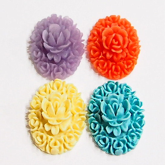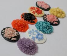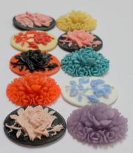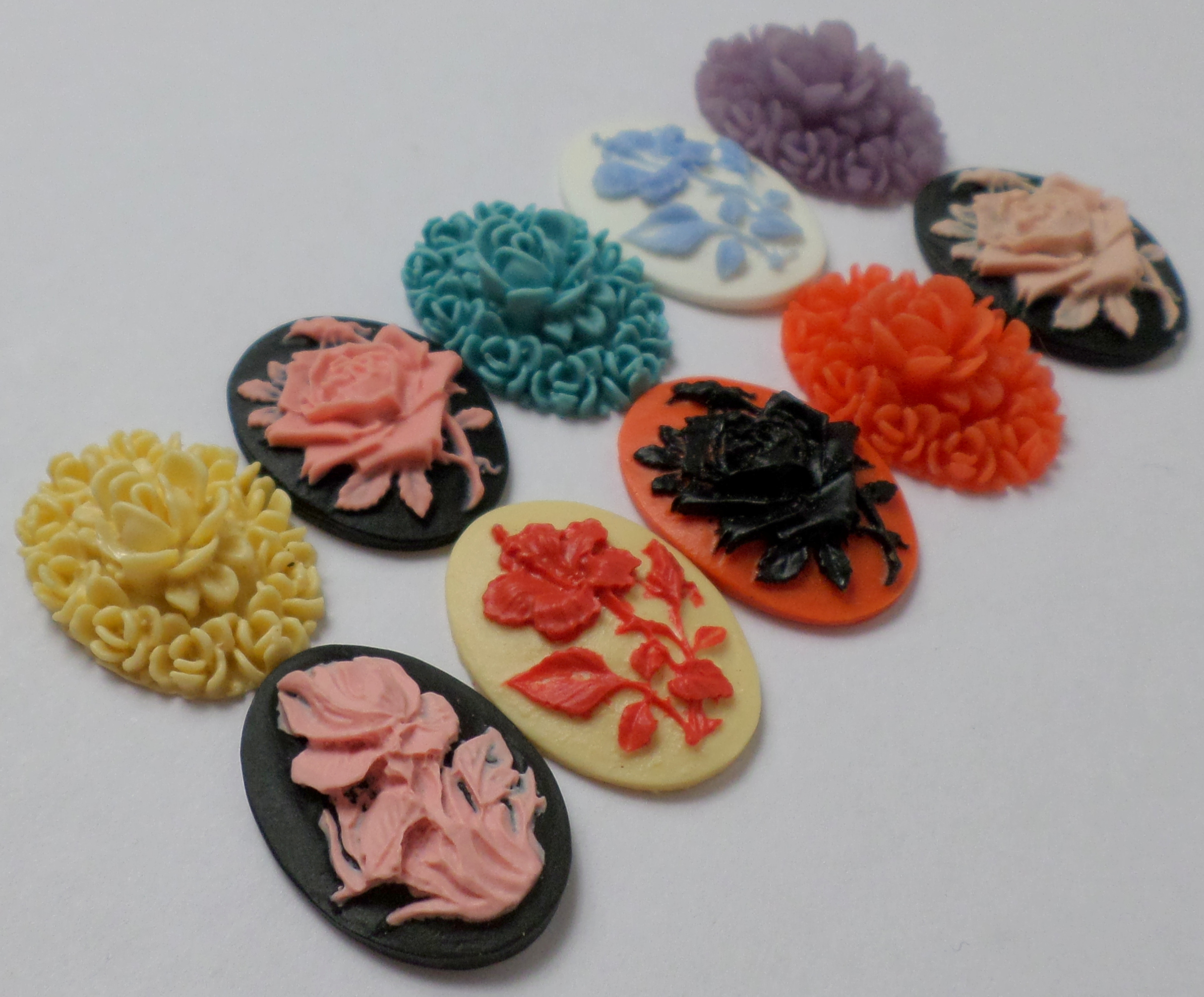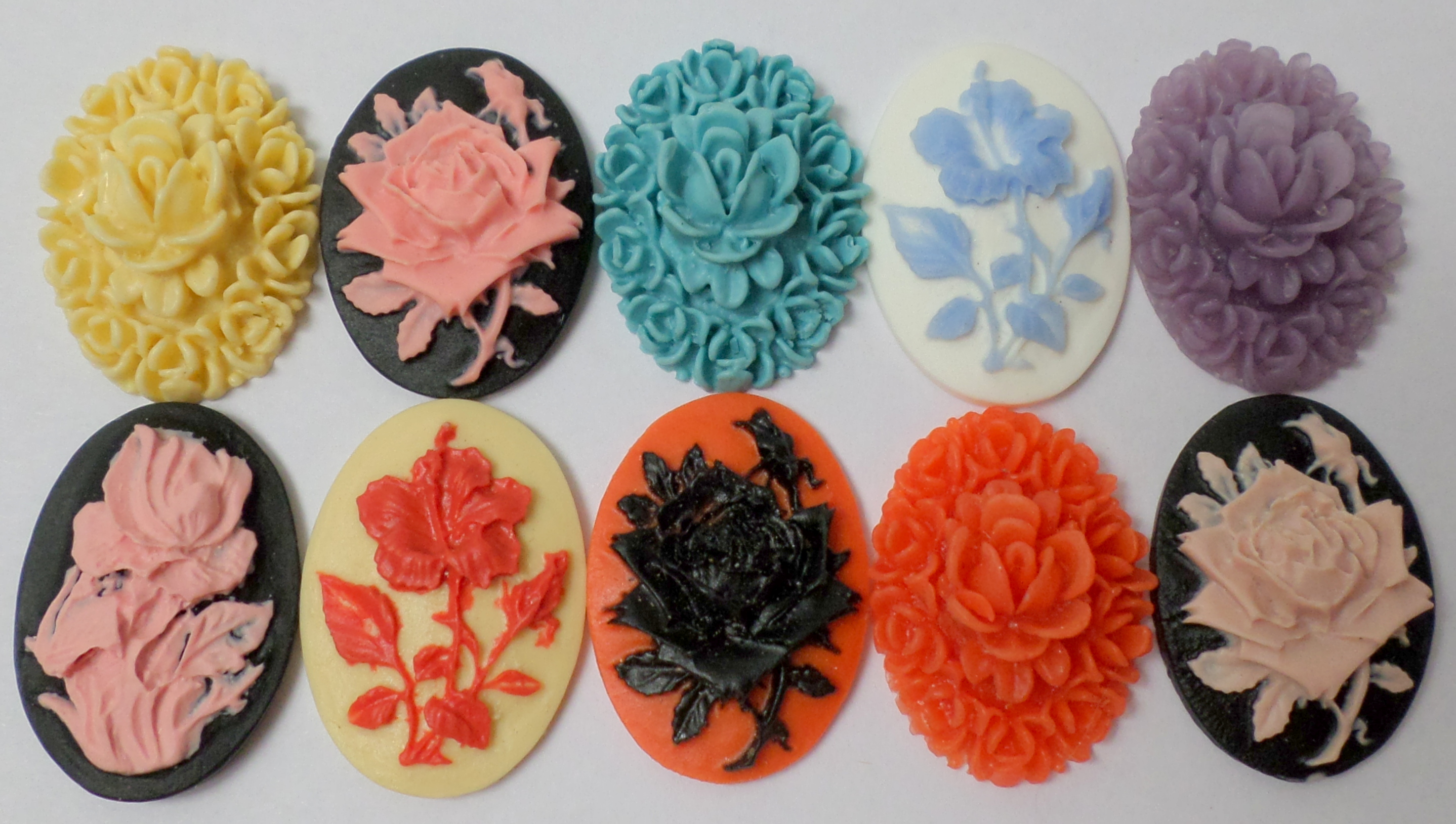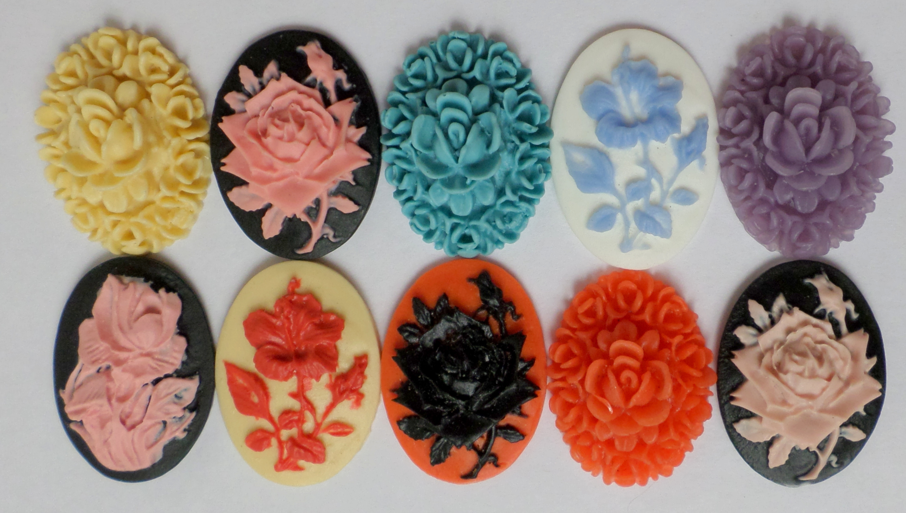 You are buying 10 different 25 mm x 18 mm resin Flower Cameos. These include Roses, Hibiscus, & Vintage Japanese Flowers. These will make any project you are starting or one you need to finish look amazing. I have lots of settings in several colors and styles that these will look fantastic in. All of these are all offered in groups of 6 of each Color. Starting on the top row left to right is the cream colored flower item #360477037985, the pink over black darker rose is item #, the aqua flower is item #360477037887, the blue over white hibiscus item #360471676524, the purple flower is item #360471676526, second row is a pink over black blooming rose item #110911242388, red over cream hibiscus item #360471675944, black over orange item #110911242388, the red flower is item #360471676521, and the last is a lighter colored pink over black rose item #110934055964. I have a lot of these that are available in 40x30 and 18x13 mm. The next to last picture is a group of 4 colors of really detailed Japanese flowers item #360471675988, sold separately. The last picture is a group of 12 different 40x30 mm gorgeous flower cameos that I offer item #110911248686, also sold separately.