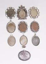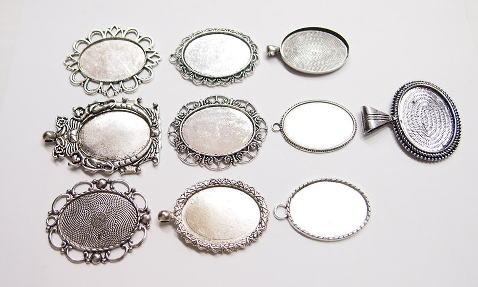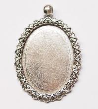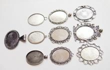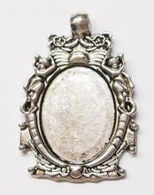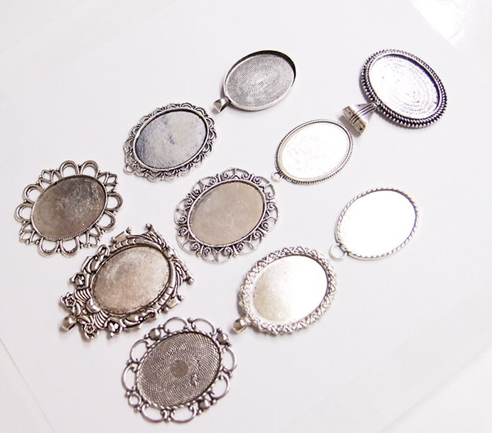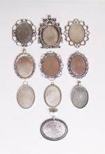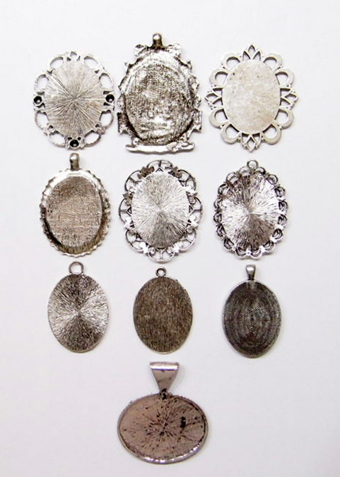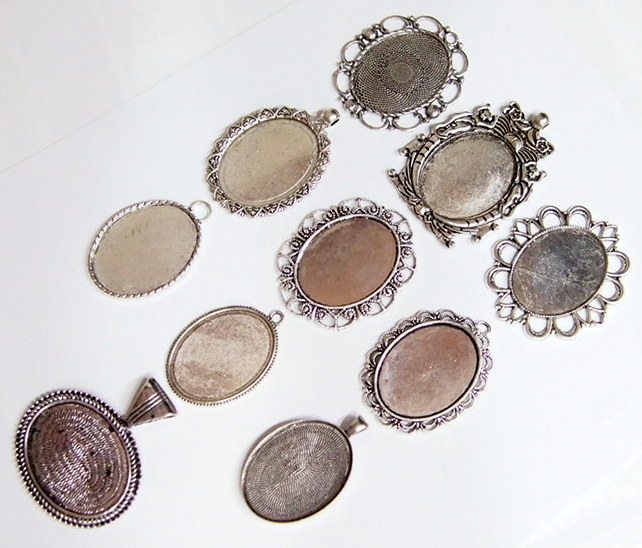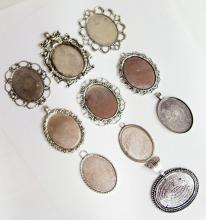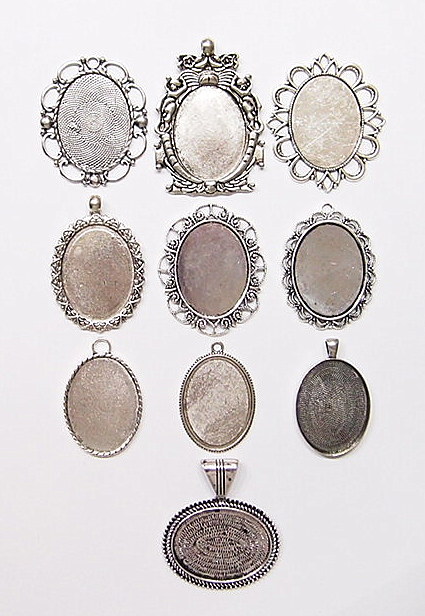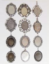 You are buying 10 Different 40 mm x 30 mm Antique Silver Plated Sturdy Pendant Settings. All of these settings were originally from some old 1900-1930's molds, I found a company to make these for me and they are gorgeous. These all have a loop at the top for your Chain or Cord or Jump Ring (which I have 3 Colors & 2 Sizes of). Three of these other than the bottom one which is a Horizontal setting can be used either in a Horizontal or Vertical orientation. Since they all have a solid back, you could go down in size a little if you had an odd size cameo, cabochon, or glass to try & fit. You will not be disappointed in the quality, it is excellent and if I was setting any cameos or cabochons, I would use these. These will work great for any cameos or cabs, they will have to be glued in. I have lots of Great Bails, Bracelets, Cameos, Chains, Connectors, Jump Rings, Lockets, Pendants, Pins, Rings & Settings so, just look at all my listings. All of these are offered in groups of 4 of each. Starting with the top row left to right is the 40x30 antique silver oval loop pendant setting item #360471676464, next is the cherub setting item #361174225851, next is the horizontal or vertical big loop pendant setting item #360471676447, next row down is the crown pattern item #111567444345, next is the delicate horizontal or vertical lace pendant setting item #110911242453, next is the ribbon and lace setting item #360892068098, next row down is the rope edge item #360478420851, next is the slightly under sized beaded band item #111066481563, next is the oval deep band item #360539084336, the bottom setting is a gorgeous beaded band horizontal setting item #360803947511. I have all of these in Antique Gold & several of these I have in 4 Colors. If you want more specific details about each one, they are all listed individually in groups of 4. This is a great collection of beautiful and well made pendant settings. The next to last picture shows the backside of them all. I have a similar group of 12 pendant settings as shown in the last picture item #361475160163, sold separately.