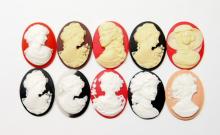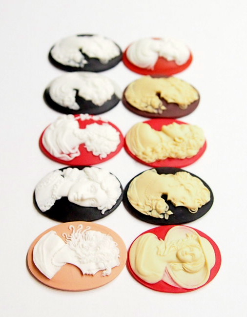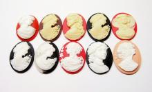You are buying 10 Different 40 mm x 30 mm Gorgeous Elegant Lady Cameos. These are all so gorgeous, all are different Elegant Lady in all color schemes Cameos. Exactly what you see is what you will receive. These are very detailed and All my cameos have never been used. The molding process of these are just great, no flaws. These are pretty fabulous. These all measure 40 mm x 30 mm. I have lots of Great Bails, Bracelets, Cameos, Chains, Connectors, Jump Rings, Lockets, Pendants, Pins, Rings & Settings so, just look at all my listings. All of these are offered in groups of 4 of each color. Starting on the top row left to right is the white over red Victorian lady with pearls item #360471677866, cream over brown item #110911255145, left facing cream over carnelian is item #110911242487, cream over black lady with a corsage is item #110926215972, and the cream over red with hat lady is item #110911248648, bottom row is white over black item #361221005331, next is the ponytail white over 2 colors item #360471676501, left facing white over red is item #110930221021, white over black Victorian long hair lady is item #110911243321, and the white over tan swept back hair lady is item #345581849326. I have lots of other Colors and Sizes of Women and Animal Cameos.
