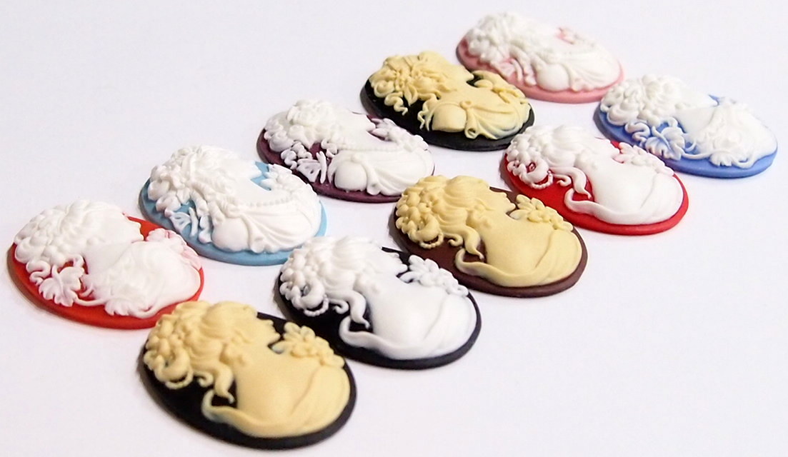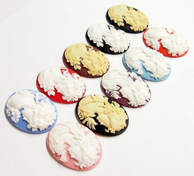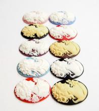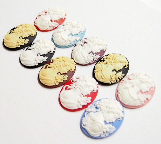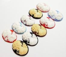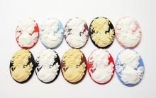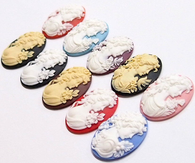 You are buying 10 Different 40 mm x 30 mm Grecian Women Cameos. These are so gorgeous, all show a different Grecian Lady in all color schemes. Exactly what you see is what you will receive. These are very detailed and All my cameos have never been used. The molding process of these are just great, no flaws. These are pretty fabulous. They all measure 40x30 mm. I have lots of Great Bails, Bracelets, Cameos, Chains, Connectors, Jump Rings, Lockets, Pendants, Pins, Rings & Settings so, just look at all my listings. All of these are offered in groups of 4 of each Color, sold separately. Starting with the top row left to right is the white over red item #360471677840, white over blue with butterflies item #110911242397, white over plum item #360471675583, cream over black with bird item #110926219514, white over pink with butterflies item #110911242404. Bottom row is cream over black floral item #360478420821, white over black floral item #360471677856, cream over brown floral item #110911244554, white over red floral item #110911248633, and the white over blue is item #360471675597. I also have several of these same cameos in 25x18 mm.