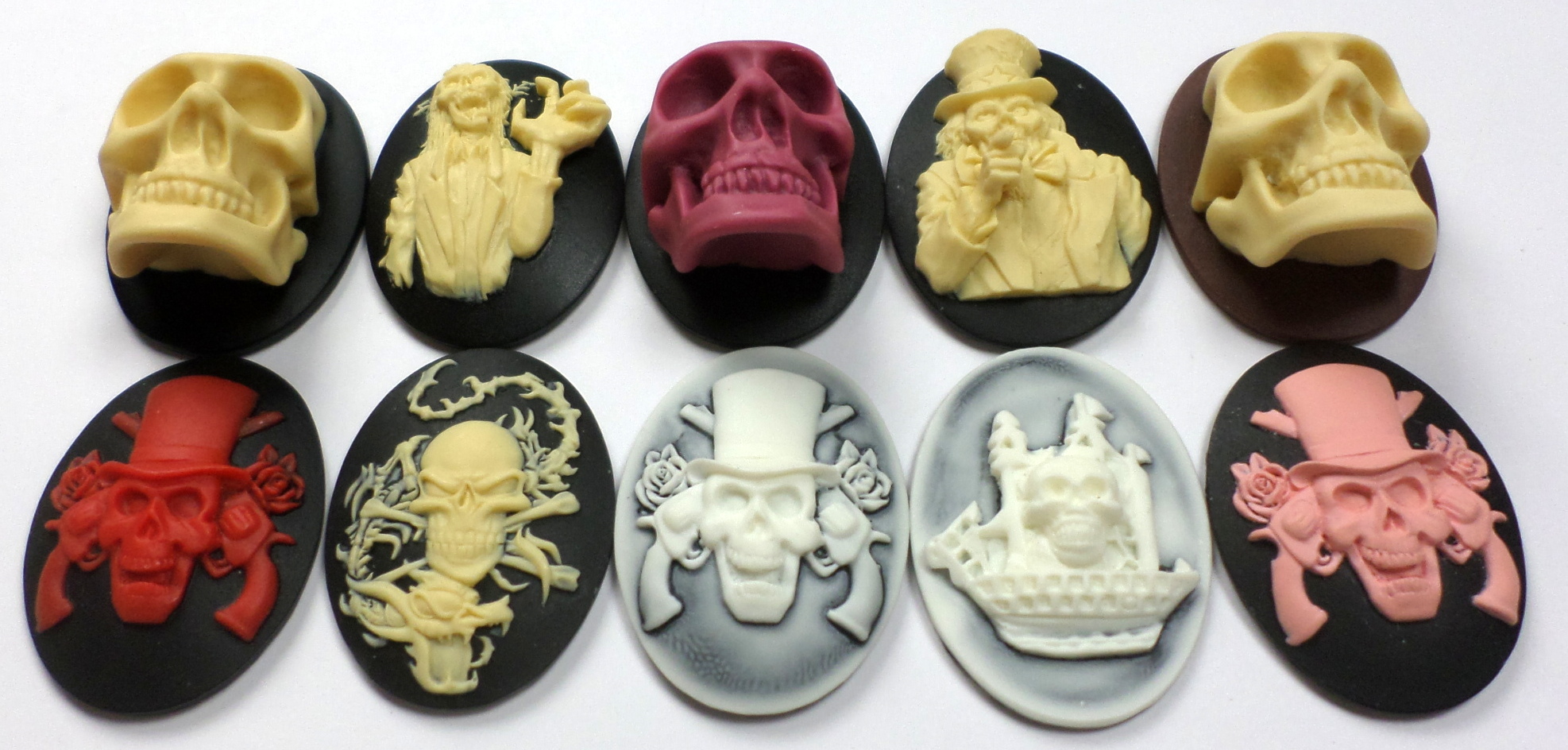 You are buying 10 Different 40 mm x 30 mm Skulls & Zombies in all color schemes Molded Resin Cameos. Exactly what you see is what you will receive. These are very detailed and All my cameos have never been used. The molding process of these are just great, no flaws. These are pretty fabulous. These all measure 40 x 30 mm. I have lots of Great Bails, Bracelets, Cameos, Chains, Connectors, Jump Rings, Lockets, Pendants, Pins, Rings & Settings so, just look at all my listings. If you have been looking at our products & wanted to try some but, didn't want to buy a lot of the same one, here is your chance to sample an assortment at a Great price. These are all offered in groups of 4 of each Color starting with the top row left to right is the cream over black 3-D skull head item #360471676497, the reaching hand zombie item #111005264008, purple over black 3-D skull head item #360471676433, cream over black Uncle SAM item #360646379745, cream over brown 3-D skull head item #110911243368, next row down left to right is the red over black guns & roses item #360471677838, cream over black skull head dragon skeleton item #111233303856, white over black Davy Jones skull & cross bones item #110911248574, white over black skull & pirate ship cameos item #110930805514, and the last is the pink over black guns & roses item #360471677819 and all of these are offered in groups of 4 separately. I have several other styles and colors of Zombie/Gothic cameos so give them all a look.
