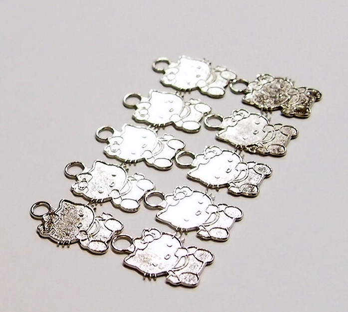 You are buying 10 Silver Plated Cute Cat with a Bow Earrings or Charms. These are adorable. They are a mirror image on both sides. These will be great as Earrings or Charms. These very cute cats are in a sitting position with, one of the front paws touching the face for, a precious pose. These measure 26 mm in length & are 16 mm in width. The top has a nice size loop (4.2 mm) for your Chain or Cord or Jump Ring (which I have 3 Colors & 2 Sizes of). The picture of all of them shows the top row facing one way then the bottom row is the other side. I have lots of Great Bails, Bracelets, Cameos, Chains, Connectors, Jump Rings, Lockets, Pendants, Pins, Rings & Settings so, just look at all my listings. These would look great in the Origami Owl Lockets I have in 2 Different Sizes, 40x30 & 25x18 item #360897089999 & Item #360931302160.
