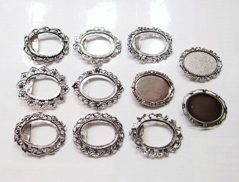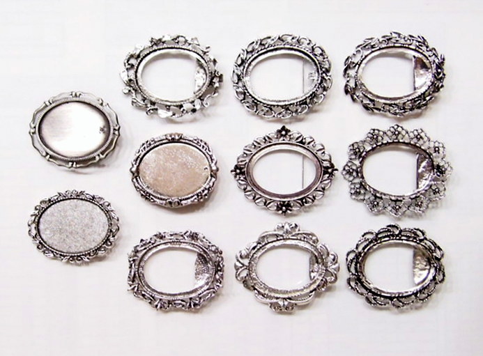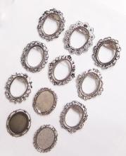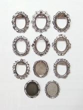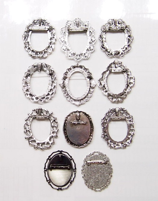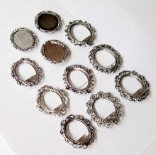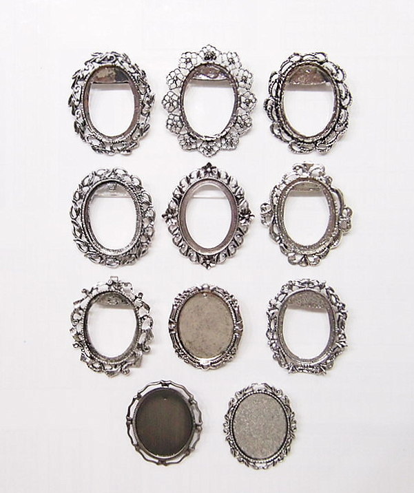 You are buying 11 Different Gorgeous 40 mm x 30 mm Antique Silver Plated Sturdy Victorian Deco Brooch Pin or Pendant Settings. All of these settings were originally from some old 1900-1930's molds, I found a company to make these for me and they are fantastic. These are all Brooch Pin or Pendant settings & they all have a loop on the back (except for the one in the middle of the second row & the one on the bottom right which has an opening you could put a chain through) so you can use them either way as a Pin or Pendant. Since three of these have a solid back, you could go down in size a little if you had an odd size cameo or cabochon to try & fit. You will not be disappointed in the quality, it is excellent and if I was setting any cameos or cabochons, or glass, I would use these. These will work great for any cameos or cabs, they will have to be glued in. I have lots of Great Bails, Bracelets, Cameos, Chains, Connectors, Jump Rings, Lockets, Pendants, Pins, Rings & Settings so, just look at all my listings. All of these are offered in groups of 4 of each color. Starting on the top row left to right is the 40x30 mm Leaves Wreath item #360483157217, next is the Flower Wreath item #360471675902, Twisted Rope item #360621908094, next row down is Wreath & Floral item #110930805528, Four Flower Wreath item #360478420843, Lefleur Design item #360471675549, next row down is the Ribbon Pin item #360471675920, Ribbon and Bow item #361033003363, the Twisted Vine is item #110911243327, bottom row is the Big Loop item #360478420756, and the last is the Wreath Pin item #361345050184. I have almost all of these in Antique Gold & several I have in 4 different Colors and in groups of four Colors. If you want more specific details about each one, these are all listed individually in groups of 4. This is a great deal on a group of really well made gorgeous Brooch Pin settings. I also have a group of 10 different than these Antique Silver 40x30 mm settings as shown in the next to last picture item #360944312815, sold separately. I also have a different group of 12 Antique Silver 40x30 mm settings as shown in the last picture item #361475160163, sold separately.