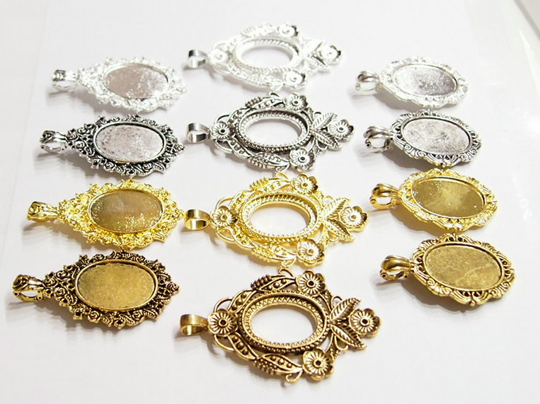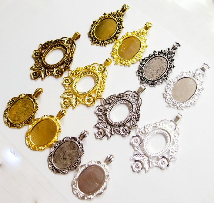 You are buying 12 Different 30 mm x 22 mm Gorgeous Victorian Style, 8 with Enhancer Bails, Pendant Settings. You will receive one set of 4 Colors with an intricate Rose pattern all around the outside of these beautiful settings which also have enhancers as their bails that can open up to wear over an existing necklace, a very nice feature as shown on the top row or buy them in a group of 4 Colors Item # 360926605856. One set of 4 Colors of Victorian Design leaf & flower pattern which are gorgeous & are fairly large as shown in the middle row or buy them in a group of 4 Colors Item # 111368028541. One set of 4 Colors of Angel Wings pattern which are very nice & have enhancers as their bails which can open up to wear over an existing necklace as shown on the bottom row or buy them in a group of 4 Colors Item # 360471675575. All of these settings are originally from the 1900-1930's, I only had a few left and found a company to make these for me & they are all Gorgeous. The designs are all just delicate, but they are very solid, not flimsy like the new ones are. You will not be disappointed in the quality, it is excellent and if I was setting any cameos or cabs, I would use these. These will work great for any cameos or cabs, they will have to be glued in. I have lots of Great Bails, Bracelets, Cameos, Chains, Connectors, Jump Rings, Lockets, Pendants, Pins, Rings & Settings so, just look at all my listings. All three sets of these are offered in groups of 4 of each Color, the roses, the leaf & flower and the angel wings settings. This listing is a chance to get one of each of all of these 12 different fantastic Victorian looking settings, to make into your very own design. Just add one of my many cameos or cabs or put you own family heirloom in one or all of these to enjoy for many years to come. Since the 8 with enhancer bails are a solid back, you could go down in size a little if you had an odd size cameo or cab to try & fit. I also offer Chains in two styles & 4 Colors that go with these just perfect. The last two pictures show the back sides.