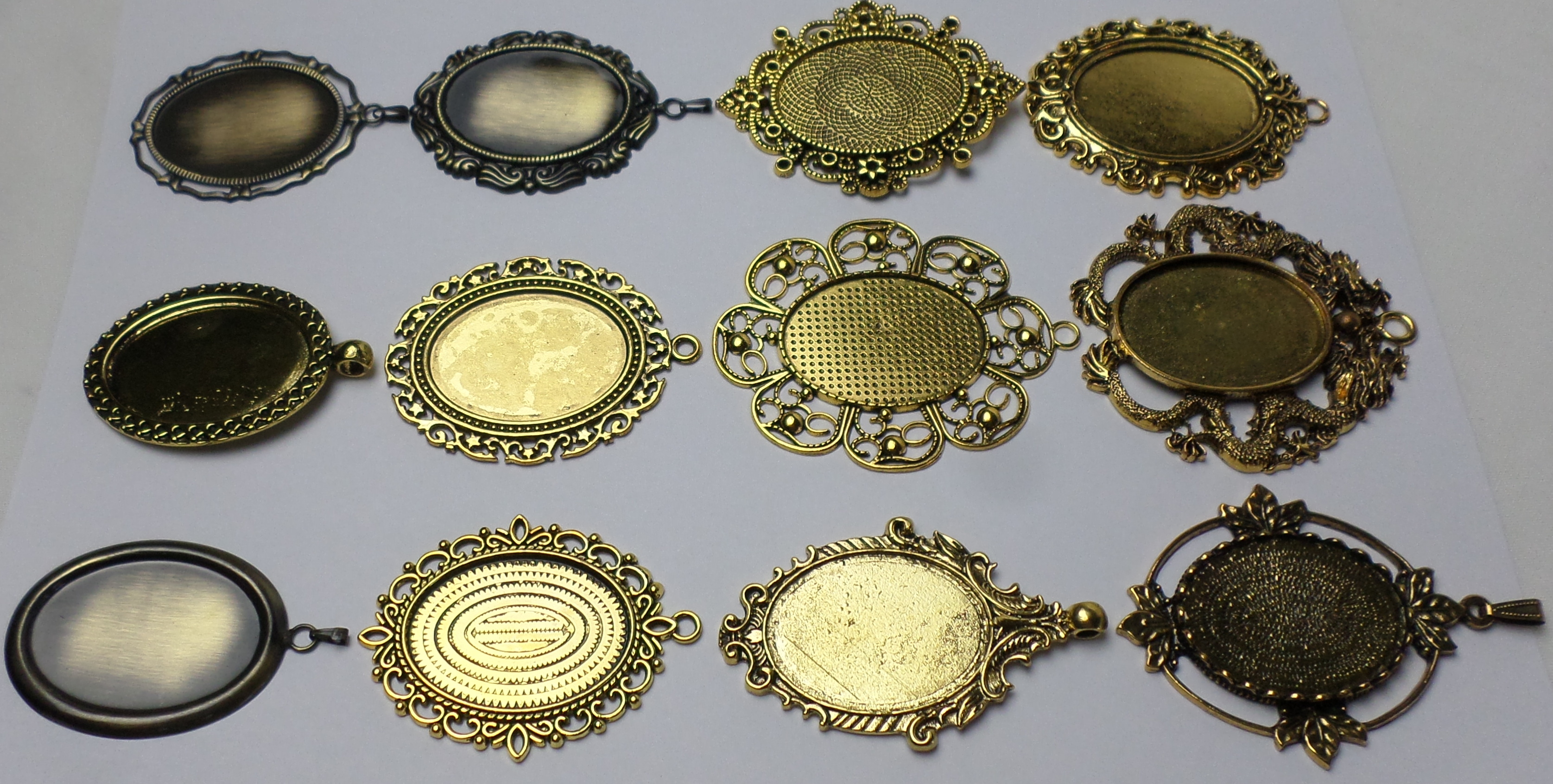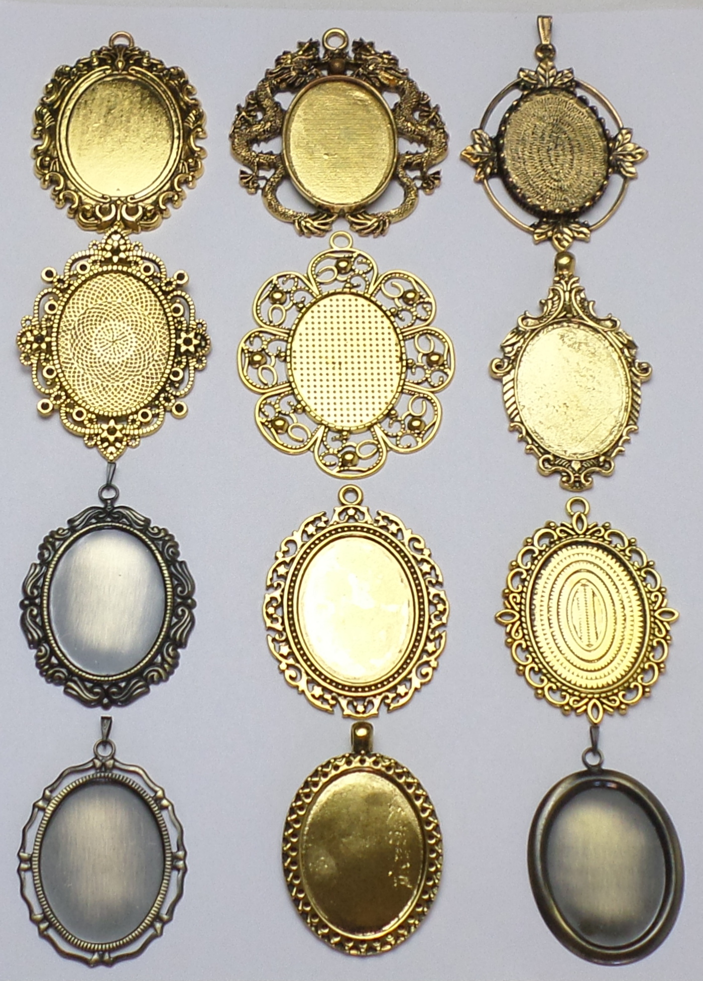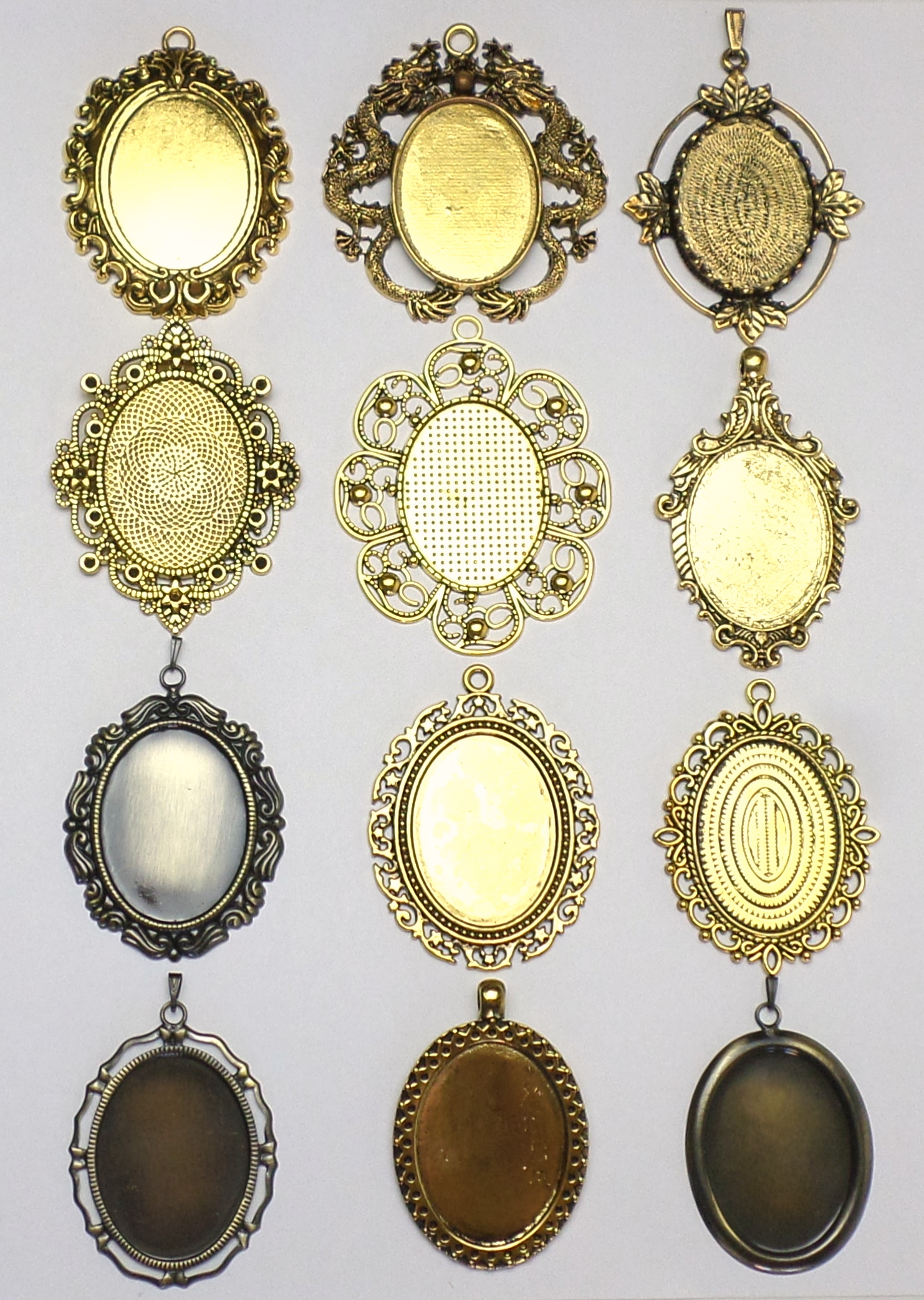 You are buying 12 Different 40 mm x 30 mm Antique Gold Plated Sturdy Pendant Settings. All of these settings were originally from some old 1900-1930's molds, I found a company to make these for me and they are gorgeous. These all have a loop at the top or back for your Chain, Cord or Jump Ring (which I have 3 Colors & 2 Sizes of). Since all of them have a solid back, you could go down in size a little if you had an odd size cameo or cabochon to try & fit. You will not be disappointed in the quality, it is excellent and if I was setting any cameos or cabs, I would use these. These will work great for any cameos or cabs, they will have to be glued in. I have lots of Great Bails, Bracelets, Cameos, Chains, Connectors, Jump Rings, Lockets, Pendants, Pins, Rings & Settings so, just look at all my listings. These are all offered in groups of 4 of each of this Color (Antique Gold) and almost all are offered in 3 other colors (Antique Silver, Shiny Gold, & Shiny Silver Plated). Starting on the top row left to right is the antique gold 40x30 mm open loops renaissance setting item #111313855294, next is the dragon setting item #361175692005, next is the old style scallop and leaf setting item #360478422126, next row down is the Victorian style item #111048211589, next is the flowered pendant setting item #111865137051, next is the old art deco style item #361459091919, next row down is the angel wings item #110911242442, next is the floral & stars item # 110997494077, next is the 4 Loops Scalloped item #111208342649, bottom row is the big loops item #360478422144, next is the crown point setting item #360678165708, and the last is the oval simple pendant setting item #360471675926. This is a great deal on a group of really well made sturdy settings. The next to last picture is showing the backside of them all. These are all offered in Antique Silver as shown in the last picture item #361475160163, sold separately. I have lots of other settings like these so give them all a look.