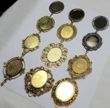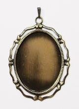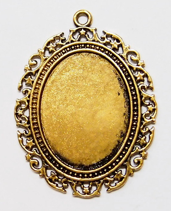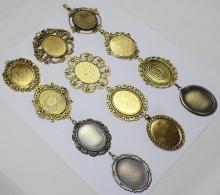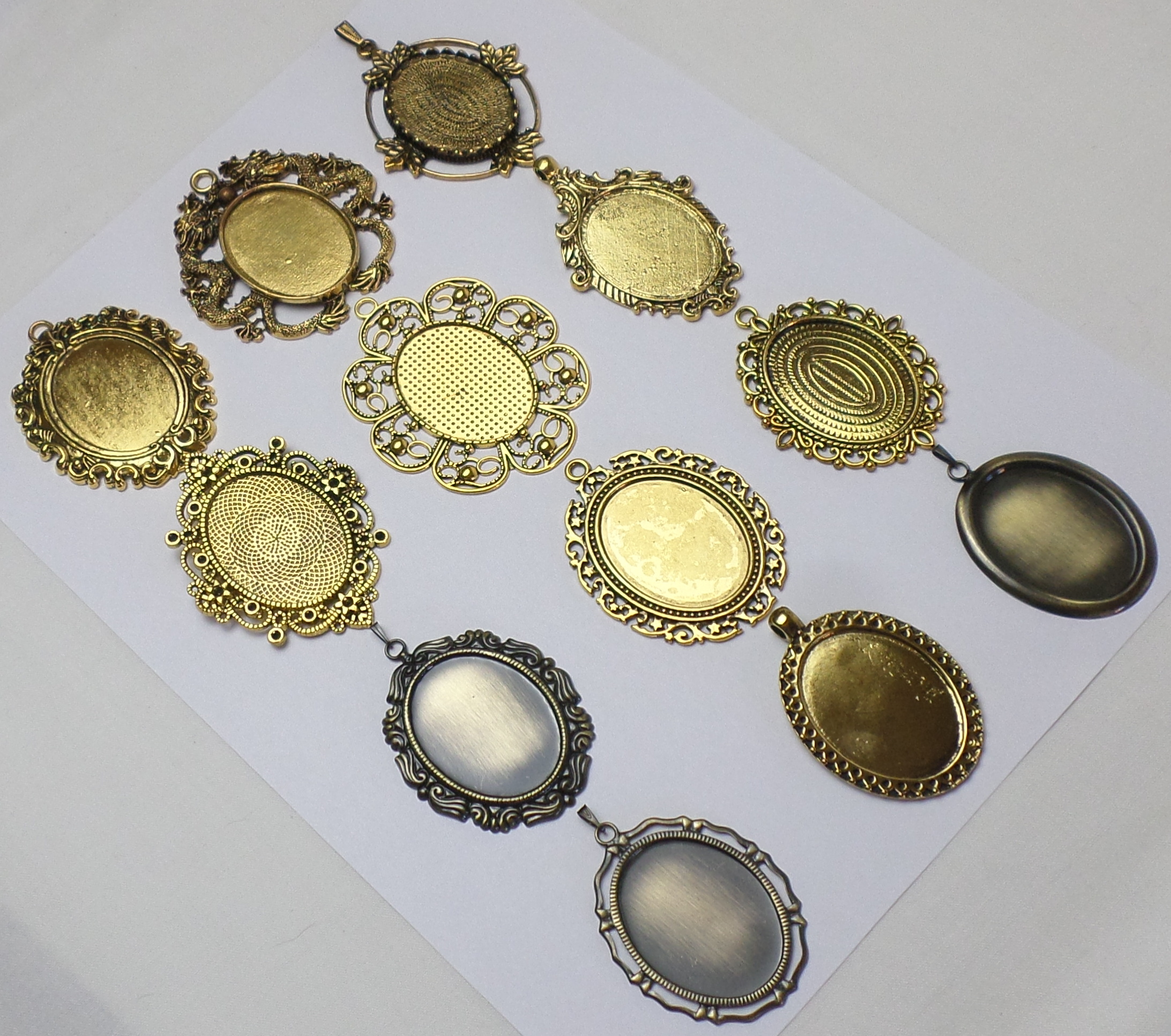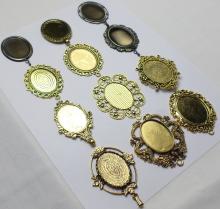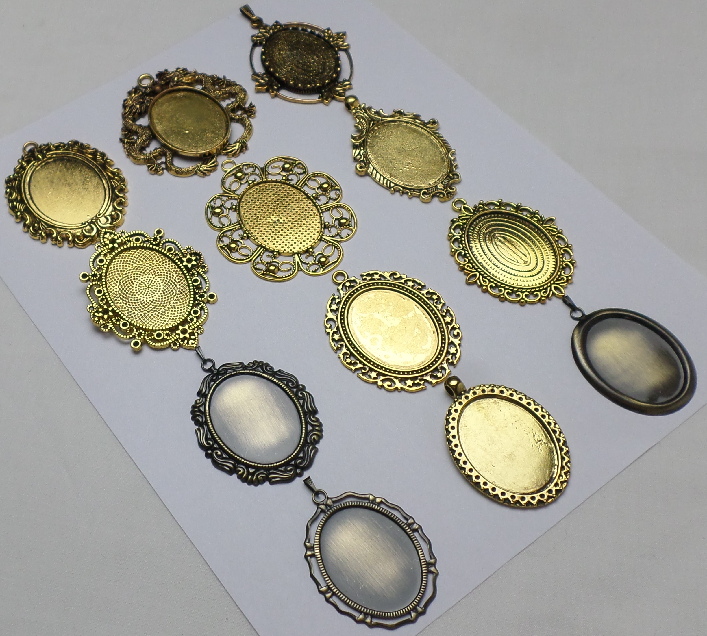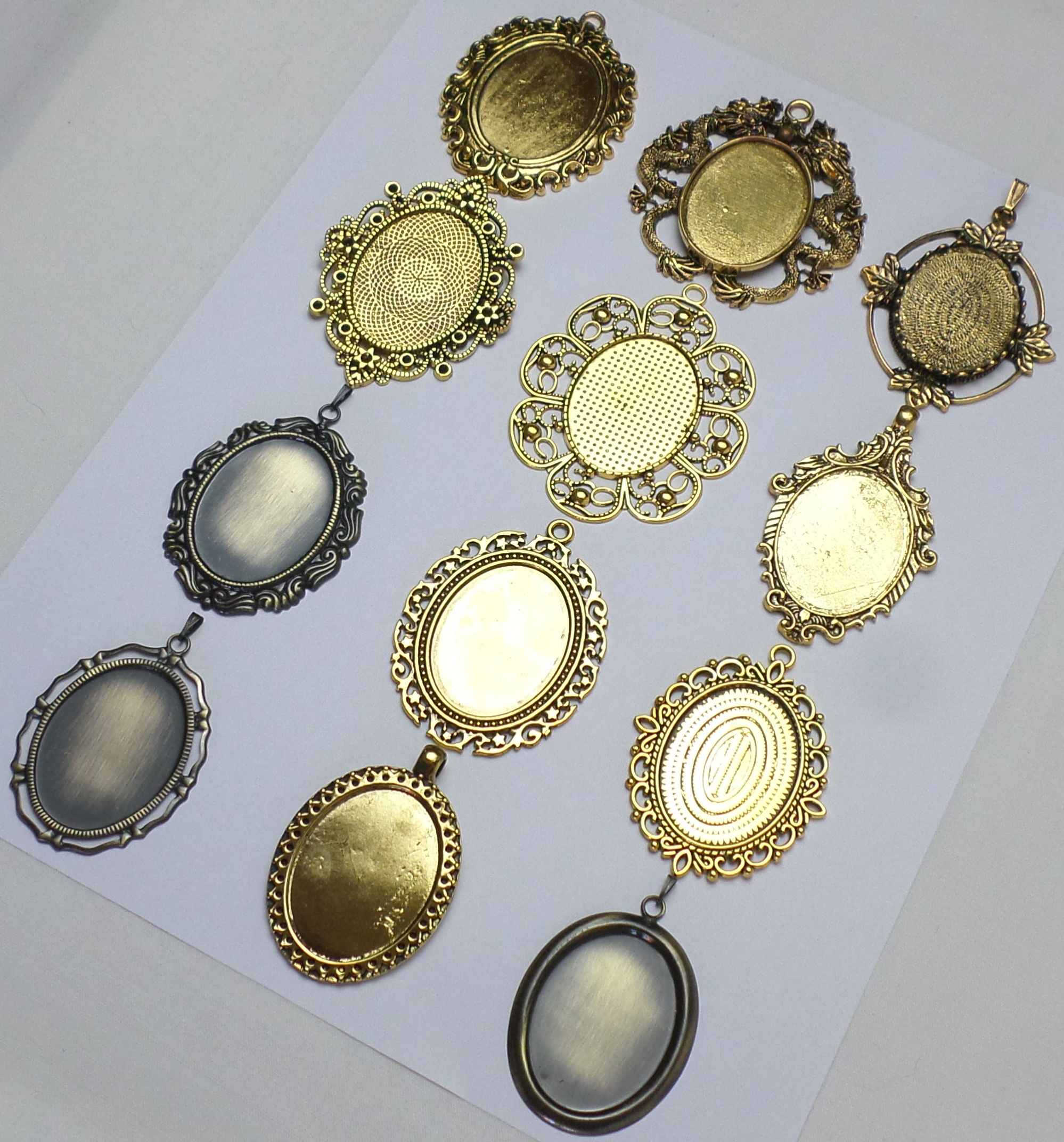 You are buying 12 Different 40 mm x 30 mm Antique Gold Plated Sturdy Pendant Settings. All of these settings were originally from some old 1900-1930's molds, I found a company to make these for me and they are gorgeous. These all have a loop at the top or back for your Chain, Cord or Jump Ring (which I have 3 Colors & 2 Sizes of). Since all of them have a solid back, you could go down in size a little if you had an odd size cameo or cabochon to try & fit. You will not be disappointed in the quality, it is excellent and if I was setting any cameos or cabs, I would use these. These will work great for any cameos or cabs, they will have to be glued in. I have lots of Great Bails, Bracelets, Cameos, Chains, Connectors, Jump Rings, Lockets, Pendants, Pins, Rings & Settings so, just look at all my listings. These are all offered in groups of 4 of each of this Color (Antique Gold) and almost all are offered in 3 other colors (Antique Silver, Shiny Gold, & Shiny Silver Plated). Starting on the top row left to right is the antique gold 40x30 mm open loops renaissance setting item #111313855294, next is the dragon setting item #361175692005, next is the old style scallop and leaf setting item #360478422126, next row down is the Victorian style item #111048211589, next is the flowered pendant setting item #111865137051, next is the old art deco style item #361459091919, next row down is the angel wings item #110911242442, next is the floral & stars item # 110997494077, next is the 4 Loops Scalloped item #111208342649, bottom row is the big loops item #360478422144, next is the crown point setting item #360678165708, and the last is the oval simple pendant setting item #360471675926. This is a great deal on a group of really well made sturdy settings. The next to last picture is showing the backside of them all. These are all offered in Antique Silver as shown in the last picture item #361475160163, sold separately. I have lots of other settings like these so give them all a look.