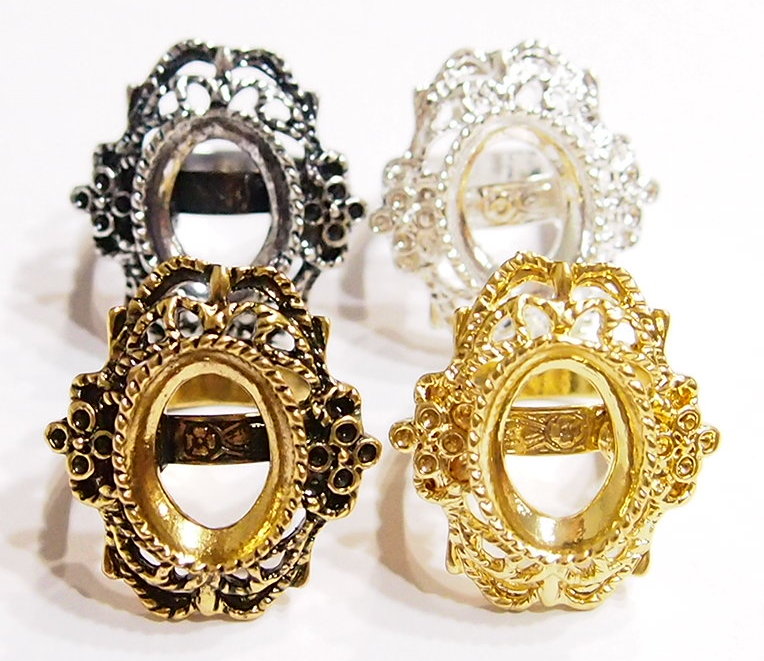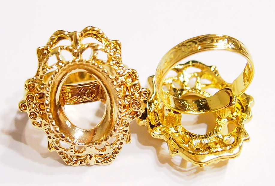 You are buying 2 of 18 mm x 13 mm Shiny Gold Plated Victorian Lacy Flower Adjustable Ring Settings. These settings are originally from the 1900-1930's, I only had a few left and found a company to make these for me. They have a gorgeous large Victorian Scroll pattern with two flowers on each end, (you could put crystals in these if you want too, but not needed). There is a small rope design around the setting. Everything about these scream Victorian, even the band is the old style band with the Victorian scroll etched on it. You will have to glue in any cameos or cabochons. Even though this is an adjustable band, everything is really sturdy and well made. These have never been used and are all new. These are great because the adjustable band is under the setting & it has the gorgeous Victorian style etchings all around it. You will not be disappointed in the quality, it is excellent and if I was setting any cameos or cabs, I would use these. I have lots of Great Bails, Bracelets, Cameos, Chains, Connectors, Jump Rings, Lockets, Pendants, Pins, Rings & Settings so, just look at all my listings. I have these in 3 other Colors & in a group of 4 Colors as shown in the next to last 2 pictures item #110911242421, sold separately. These are also offered in a group of 9 Different Styles of Rings in 14x10 (2) & 18x13 (7) in this Color as shown in the last picture item #360483150197, sold separately.