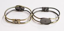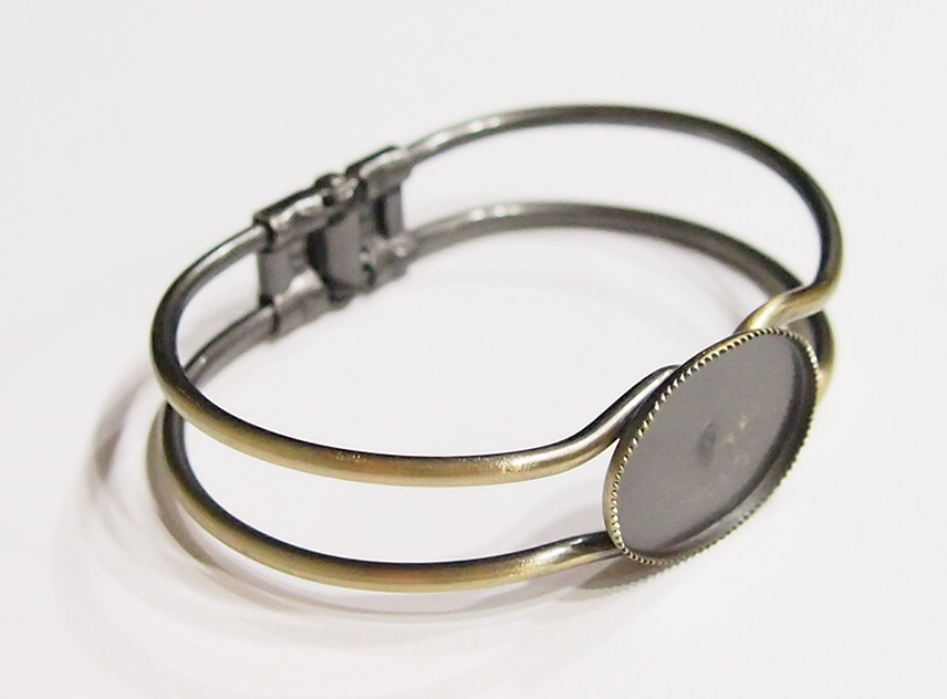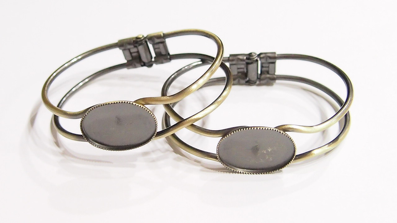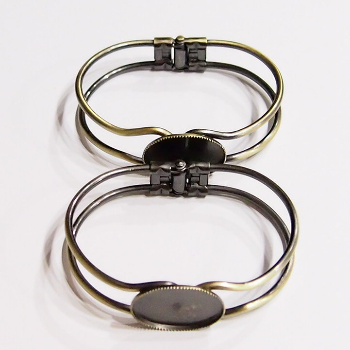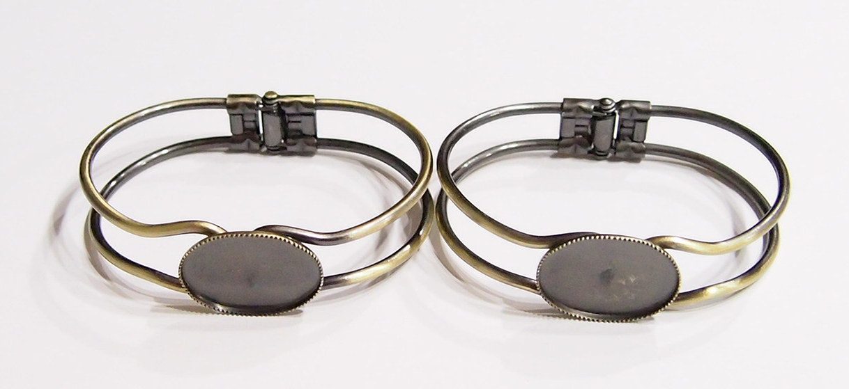 You are buying 2 of 25 mm x 18 mm Antique Gold Plated Hinged Bracelet Settings for Cameos or Cabochons. These are vintage reproductions and are brand new. These have a hinged back and they clamp together under the setting part of these gorgeous & very fashionable Bracelets. These are sturdy and cameos, cabochons, glass, or whatever you want, will have to be glued in. The biggest size that will fit in these are 25 mm x 18 mm. Since they are a solid back, you could go down in size a little if you had an odd size cameo or cab to try & fit. You will not be disappointed in the quality, it is excellent and if I was setting any cameos or cabs, I would use these. I have lots of Great Bails, Bracelets, Cameos, Chains, Connectors, Jump Rings, Lockets, Pendants, Pins, Rings & Settings so, just look at all my listings. I have these in 1 other Color, Shiny Gold item #110919843053, & in a group of 4 with 2 of each Antique God & Gold Item #110919859718-1 as shown in the last picture, sold separately.