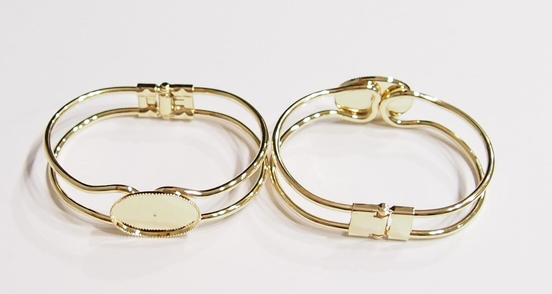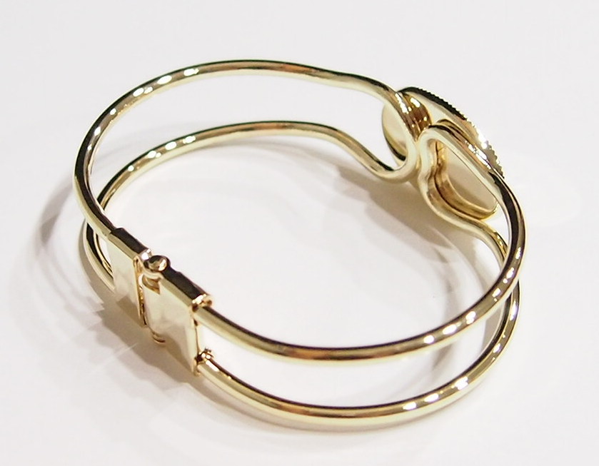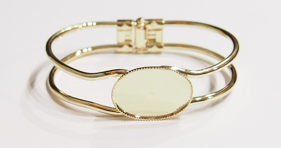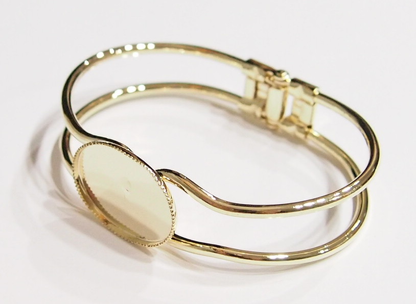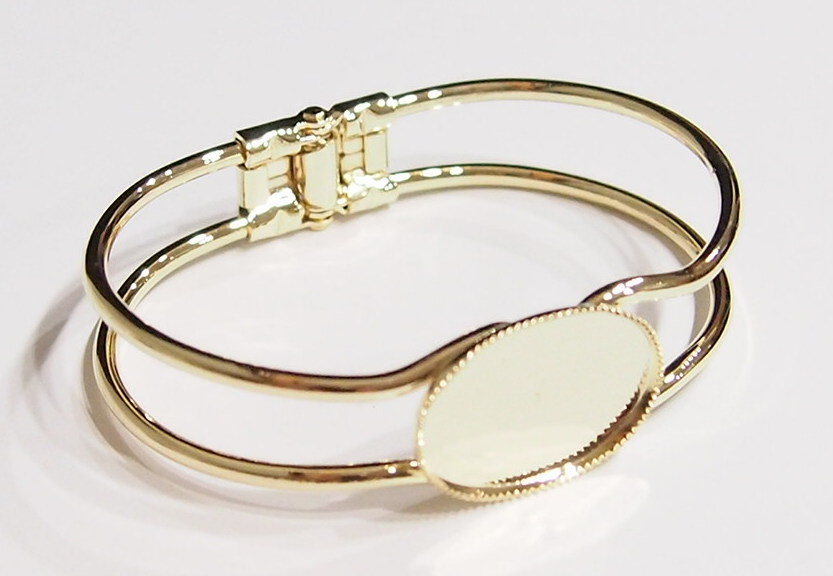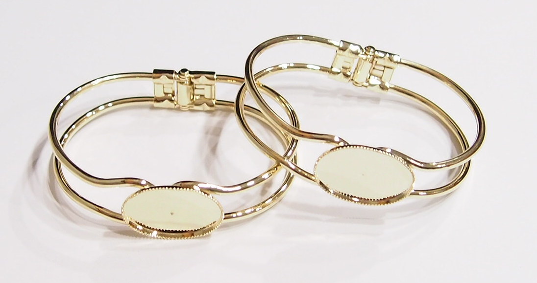 You are buying 2 of 25 mm x 18 mm Gold Plated Hinged Bracelet Settings. These are vintage reproductions and are brand new. These have a hinged back and they clamp together under the setting part of these gorgeous & very fashionable Bracelets. These are sturdy and cameos, cabochons, glass, or whatever you want, will have to be glued in. The biggest size that will fit in these are 25 mm x 18 mm. Since they are a solid back, you could go down in size a little if you had an odd size cameo or cabochon to try & fit. You will not be disappointed in the quality, it is excellent and if I was setting any cameos or cabs, I would use these. I have lots of Great Bails, Bracelets, Cameos, Chains, Connectors, Jump Rings, Lockets, Pendants, Pins, Rings & Settings so, just look at all my listings. I have these in 1 other Color Antique Gold item #110919859718. These are also offered in a group of 2 Colors (2 Shiny Gold & 2 Antique Gold) for a total of four bracelets as shown in the last 2 pictures item #110919859718-1, sold separately.
