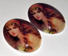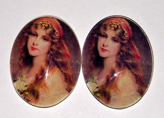 You are buying 2 of 40 mm x 30 mm Glass Angelic Face Bohemian Gypsy Woman Cameos. These have a young woman wearing a bandanna & her hair is styled in bohemian fashion. The depths of the colors & the details of these is Unbelievable. I have lots of Great Bails, Bracelets, Cameos, Chains, Connectors, Jump Rings, Lockets, Pendants, Pins, Rings & Settings so, just look at all my listings. These are offered in a group of 4 Gorgeous Glass Cameos as shown in the next to last picture item #111372093231. I also have these in a group of 10 different Gorgeous Glass Cameos as shown in the last picture item #110911242391. I also have a group of 10 Glass 25x18 mm Cameos item #110930805537. I also offer a group of 18 different Fairies or Angels in 40x30 mm item #111563956363 & in 25x18 mm item #111210026164. I do have another similar group of 4 different Glass Women Cameos item #360482877199.