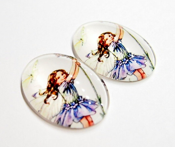 2 of 40x30 mm Swinging on flower Child Angel or Fairy Glass Cameos, Very Nice