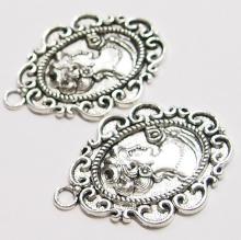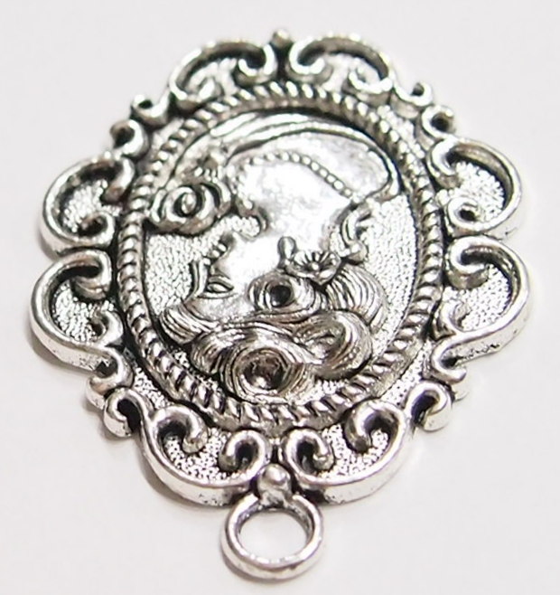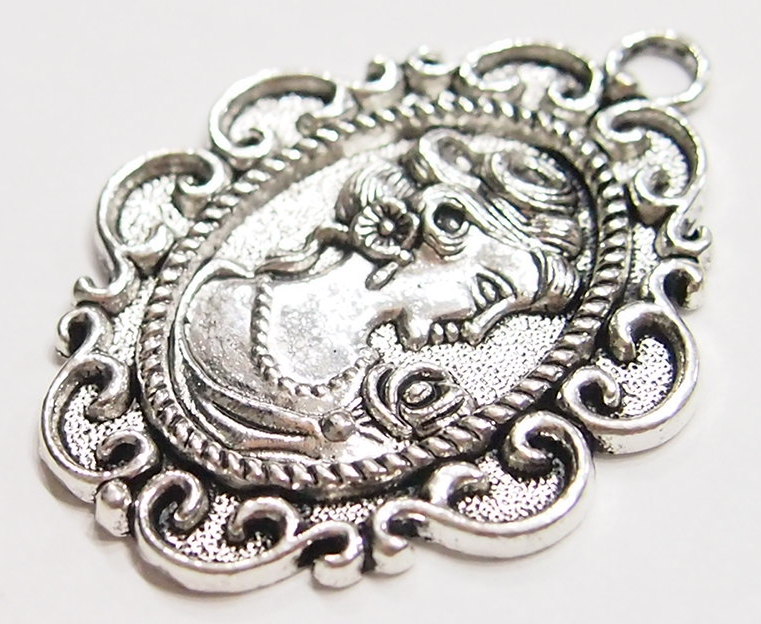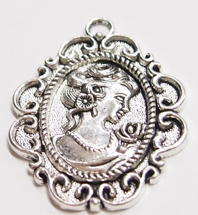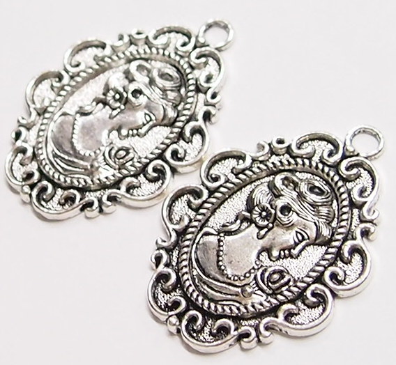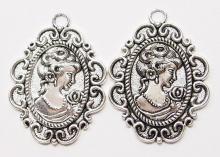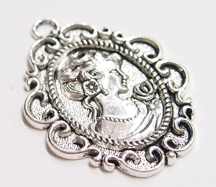You are buying 2 of 51 mm x 38 mm Antique Silver Plated Victorian Woman Classic Cameo Pendants. These are sturdy antique silver plated ready to wear pendants showing a young woman with a rose corsage & pearls outlined in a beautiful frame. The top has a nice size loop (4.9 mm) for your Chain or Cord or Jump Ring (which I have 3 Colors & 2 Sizes of). These have a gorgeous beaded edge around the Cameo & Victorian Style Scroll Pattern all around the outside of these Gorgeous Pendants. These are ready to wear, nothing needs to be added or made into. These are all metal. I have lots of Great Bails, Bracelets, Cameos, Chains, Connectors, Jump Rings, Lockets, Pendants, Pins, Rings & Settings so, just look at all my listings. This is also offered in a group of 4 different all metal ready to wear pendants as shown in the last picture item #110911242406, sold separately.