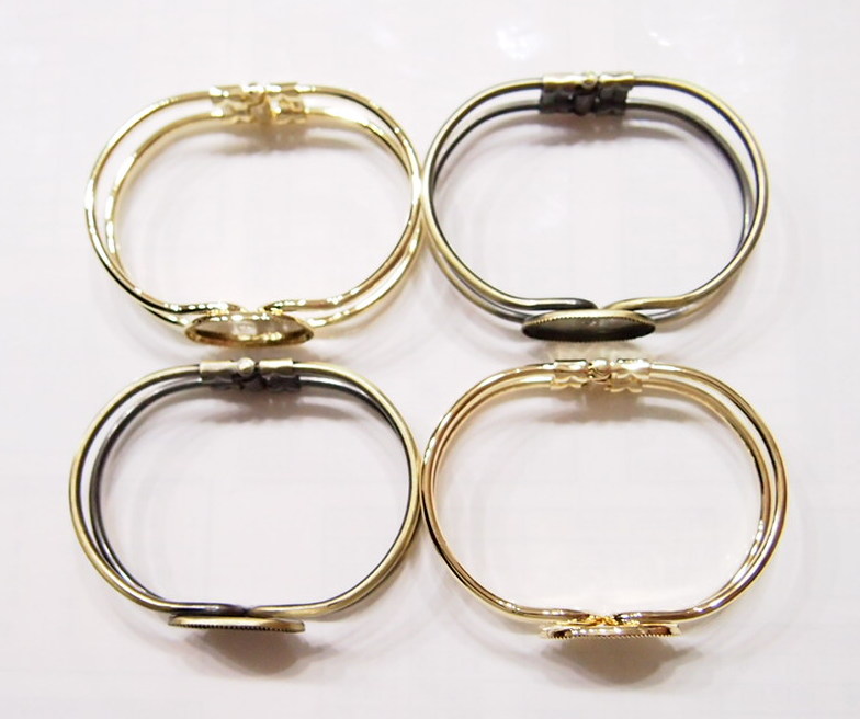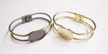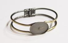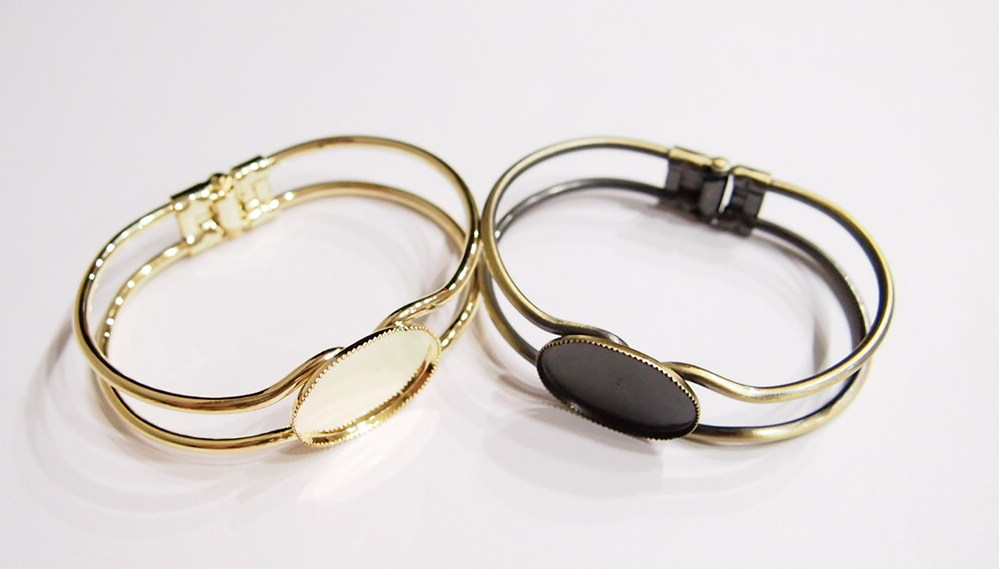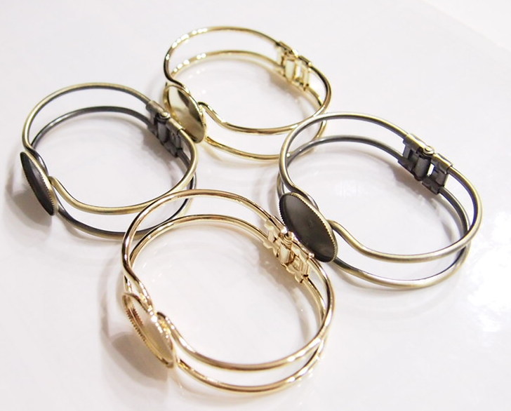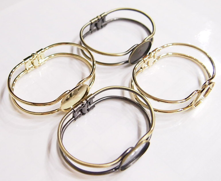 You are buying 2 Colors of 25 mm x 18 mm Hinged Bracelet Settings for Cameos, Cabochons, or Glass (4 Total). You will receive two each Antique Gold, and two Shiny Gold, these are all Plated. These are vintage reproductions and are brand new. These have a hinged back and they clamp together under the setting part of these gorgeous & very fashionable Bracelets. These are sturdy and cameos, cabochons, glass, or whatever you want will have to be glued in. The biggest size that will fit in these are 25 mm x 18 mm. Since they are a solid back, you could go down in size a little if you had an odd size cameo or cab to try & fit. You will not be disappointed in the quality, it is excellent and if I was setting any cameos or cabs, I would use these. I have lots of Great Bails, Bracelets, Cameos, Chains, Connectors, Jump Rings, Lockets, Pendants, Pins, Rings & Settings so, just look at all my listings. Both of these are offered in groups of 2 of each Color. The Antique Gold is item #110919859718 and Shiny Gold is item #110919843053. I have lots of other Bracelets in several Colors, Styles, & Sizes so give them all a look!!