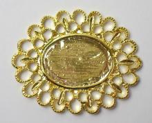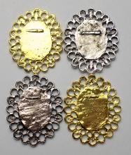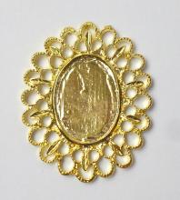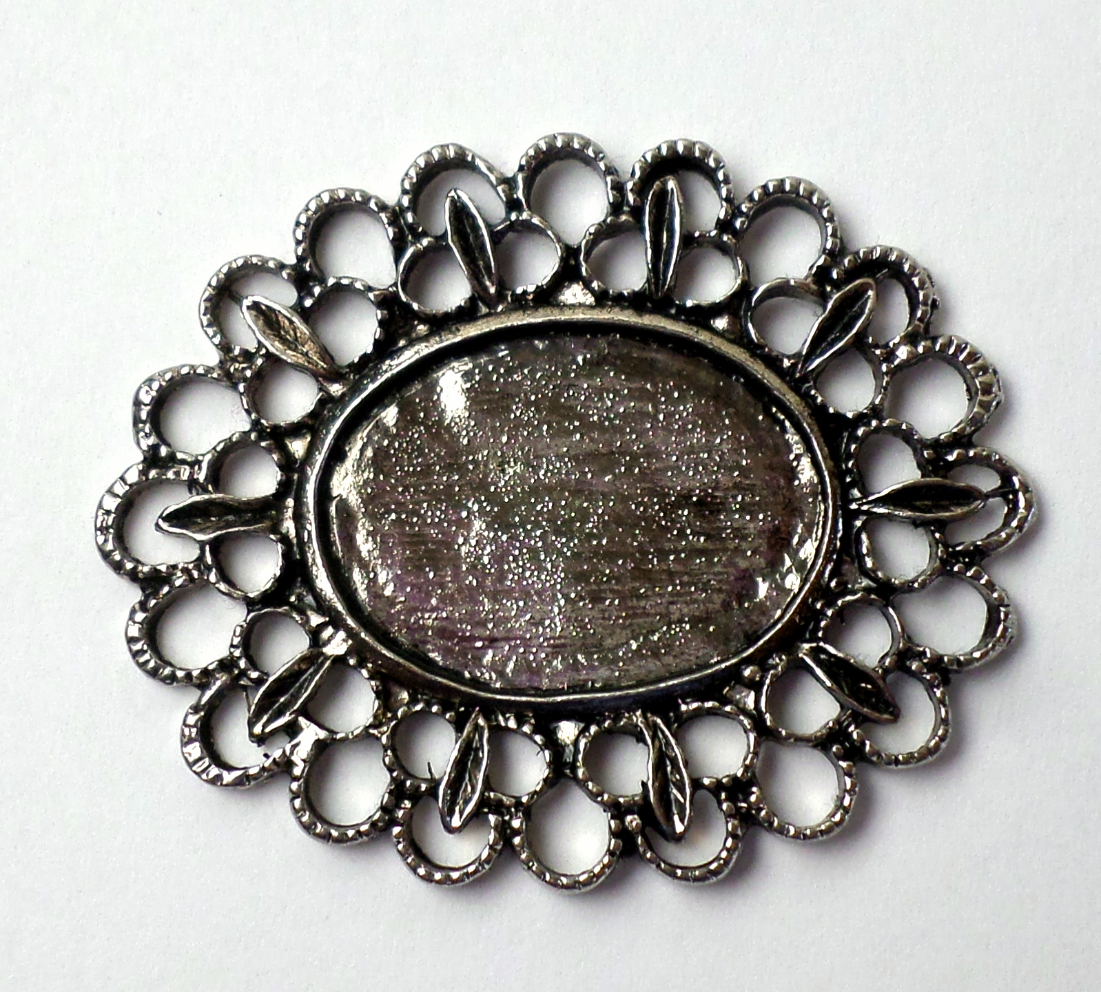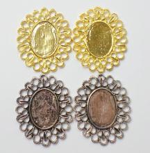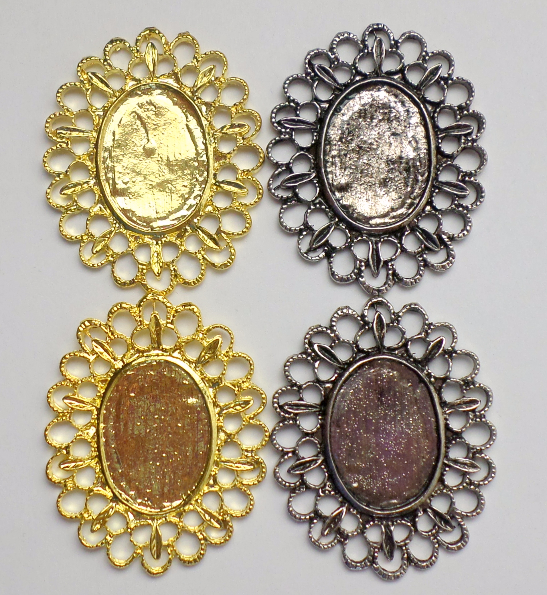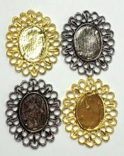 You are buying 2 different Colors of 25 mm x 18 mm Loops & Leaves Horizontal or Vertical Pendant Settings. You will receive 2 antique silver and 2 shiny gold plated settings for a total of 4. The outside dimensions are 46 x 7 mm. The top & sides have loops for your Chain or Cord or Jump Ring (which I have 3 Colors & 2 Sizes of). You can use these either Horizontal or Vertical. You will have to glue in any cameos or cabochons you want to put into the settings, no prongs and they are very sturdy. The design is very nice with a scalloped looped edge all around and single leaves running through the pattern. These have never been used. These are exactly made for 25x18 mm, but with this being a solid backing, you can go down a little on the size is you have an odd size Cameo or Cabochon to try and fit. Everything is solidly made. They have a gorgeous Victorian look to them. I have lots of Great Bails, Bracelets, Cameos, Chains, Connectors, Jump Rings, Lockets, Pendants, Pins, Rings & Settings so, just look at all my listings. These are both available in groups of 4 of each color.The shiny gold is item #360478420832 and the antique silver is item #110930805576. The last picture shows the backside of the settings.