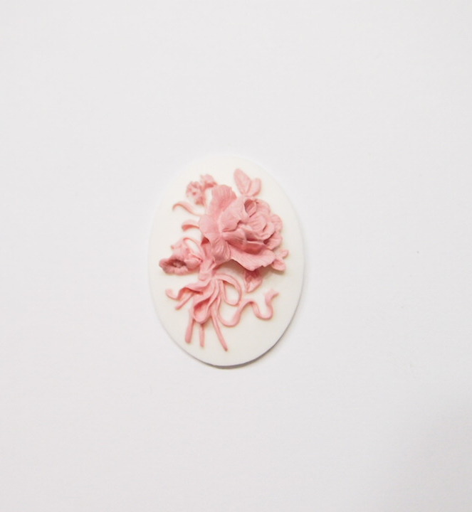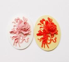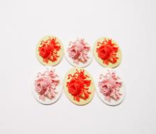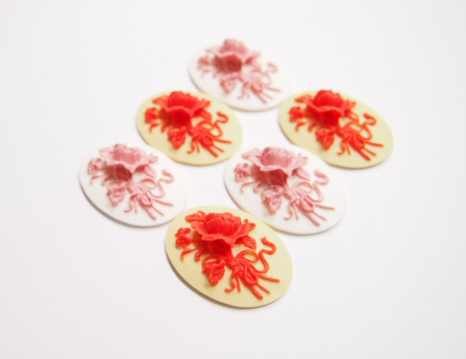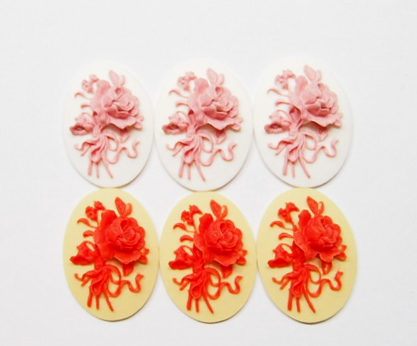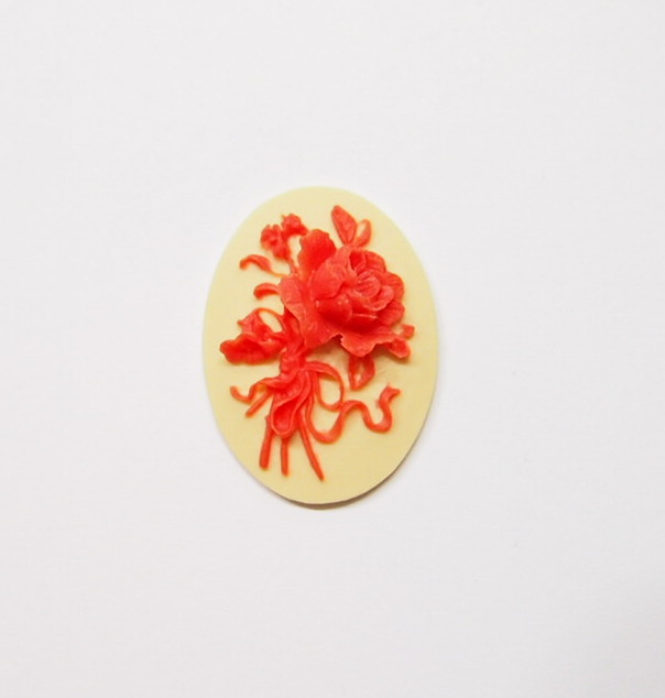 You are buying 2 Colors of 32 mm x 24 mm Rose Bouquet Cameos (6 total). These are 2 different Colors of a Rose Bouquet with Ribbon or Lace Cameos. You will receive 3 Pink over White and 3 Reddish orange over Cream. These are so gorgeous, you will have 2 different Colors of Beautiful Flower Cameos for your Gifts or Jewelry making projects. These stand out away from the face of the Cameo to give them the 3-D effect & the details of the flower pedals & the lace is fantastic. These have a very nice color combination. The molding process of these are just great, no flaws. If you have a setting that is a bit bigger just center it. You can always file these down to fit whatever you want to set these in if your setting is a bit smaller. You can use these either Horizontal or Vertical. I have several different settings these will fit in. They look very detailed for their size. I have lots of Great Bails, Bracelets, Cameos, Chains, Connectors, Jump Rings, Lockets, Pendants, Pins, Rings & Settings so, just look at all my listings. Both of these Colors are offered in groups of 6 of each Color. The Pink over White is item #110911242403 and the Reddish Orange is item #110911242422.