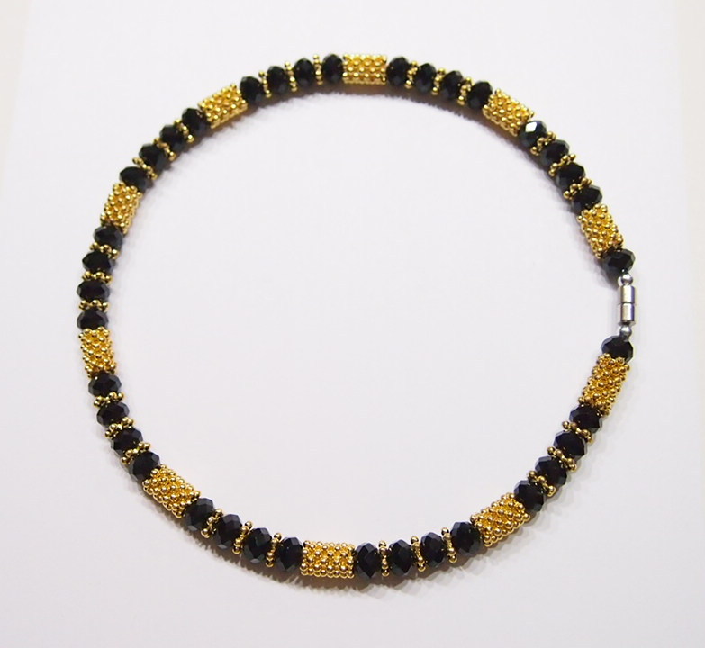 You are buying a 20 inch long Gold 10 mm Spacer with Black Glass (these look like Czech) Faceted Rondelle Bead Necklace. The Necklace is strung with wire so they should never break & has a silver triple strength magnetic clasp on the ends. No more messing with cumbersome or hard to latch hooks or toggles. The colors & shape of these reflect all the light. The Glass beads are all faceted rondelles. This is a very nice color combination. The magnetic clasp on these is VERY STRONG. You wont be disappointed in the colors or quality of this handmade, fine quality necklace. I have lots of Great Bails, Bracelets, Cameos, Chains, Connectors, Jump Rings, Lockets, Pendants, Pins, Rings & Settings so, just look at all my listings. I have these in 5 other Colors & in a group of 6 Colors as shown in the last picture.
