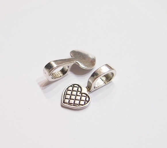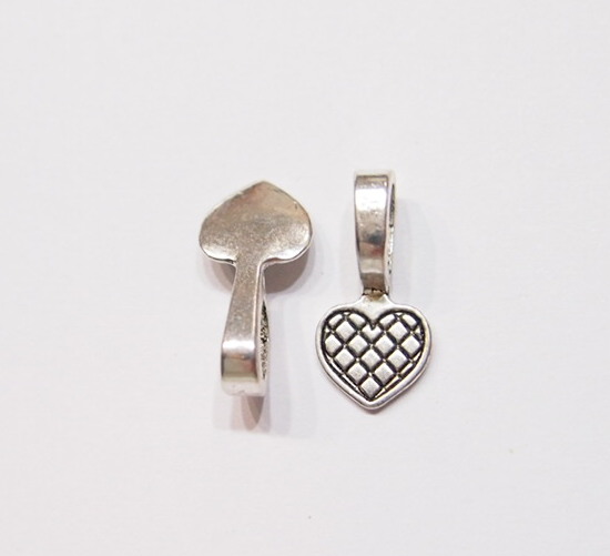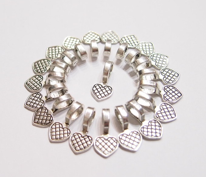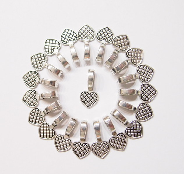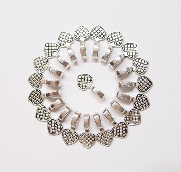 You are buying 20 Antique Silver Plated Medium Size Heart Shaped Glue on Bails. These are in a Heart shape. These measure 19 mm long x 9.7 mm wide with a nice size loop(6.5 mm x 4.4 mm), that will fit most any Chain or Cord. You can glue these to just about anything to really make them stand out. These will help you start or finish any project you have. These are exactly what you need to make anything into a pendant like, a family heirloom or just anything you want to wear. I have these in 3 other Colors & in a group of 21 Colors with 6 different styles & 4 Colors as seen in the last picture item #110911244722.