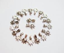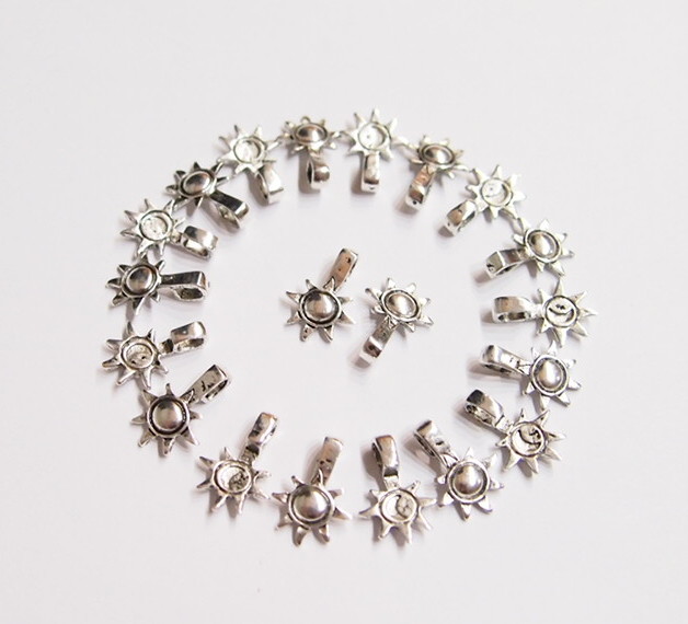 You are buying 20 Sun & Moon Shaped Antique Silver Plated Medium Size Glue on Bails. These will help you start or finish any project you have. These are in a Sun & Moon Design. These measure 17 mm long x 12 mm wide & the loop is 4 mm x 3 mm, that will fit most any chain or cord. You can glue a small to large item with this type of bail. These are exactly what you need to make anything into a pendant. Like glass, tiles, and cameos or cabs or just wear your favorite Heirloom or Cherished treasure. I Also offer a group of four Colors in Medium size Pinch Bails (I also have them in Small & Large in 2 Colors) as shown in the next to last picture item #361461307483. Also offered is a group of 21 Different Glue Bails, in 6 Styles & 4 Colors, as shown in the last picture item #110911244722.