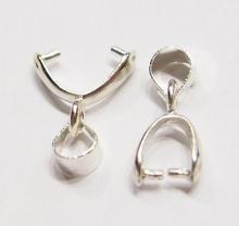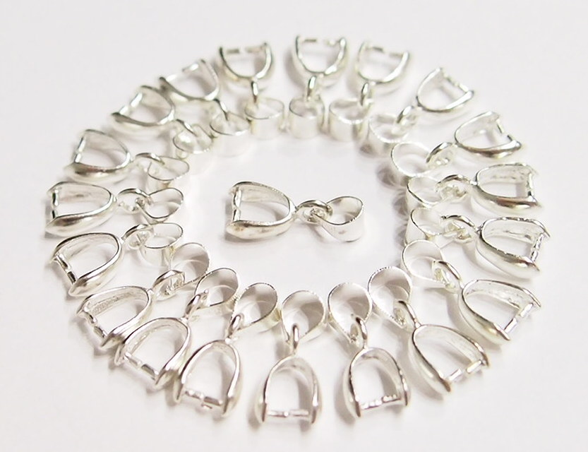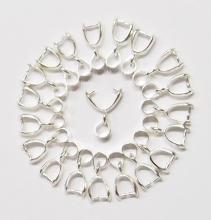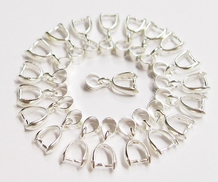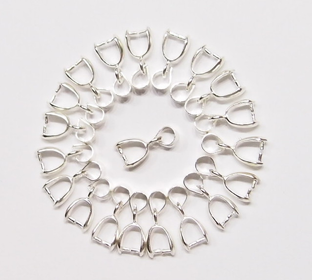 You are buying 20 Small Silver Plated Pinch Bails. These measure 15 mm long x 7 mm wide with a nice big loop, that will fit most any chain or cord. These are 15 mm in total length, and are 7 mm wide closed & are 3 mm thick. These will open to 10 mm and the grip length is 5 mm. These are exactly what you need to make anything into a pendant or earrings whether it be glass, tiles, cameos or cabochons, etc. I have lots of Great Bails, Bracelets, Cameos, Chains, Connectors, Jump Rings, Lockets, Pendants, Pins, Rings & Settings so, just look at all my listings. I have these in 2 other sizes of Silver (medium is item #361266946496 and the Large is item #112196140198) and in 3 sizes of Gold Plated (small, medium and large). I also offer a group of four Colors in Medium size Pinch Bails (I also have them in Small & Large in 2 Colors) as shown in the next to last picture item #361461307483, sold separately. Also offered is a group of 21 Different Glue on Bails, in 6 Styles & 4 Colors, as shown in the last picture item #110911244722, sold separately.