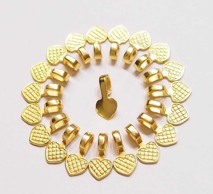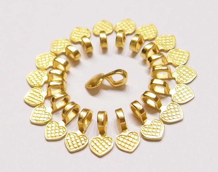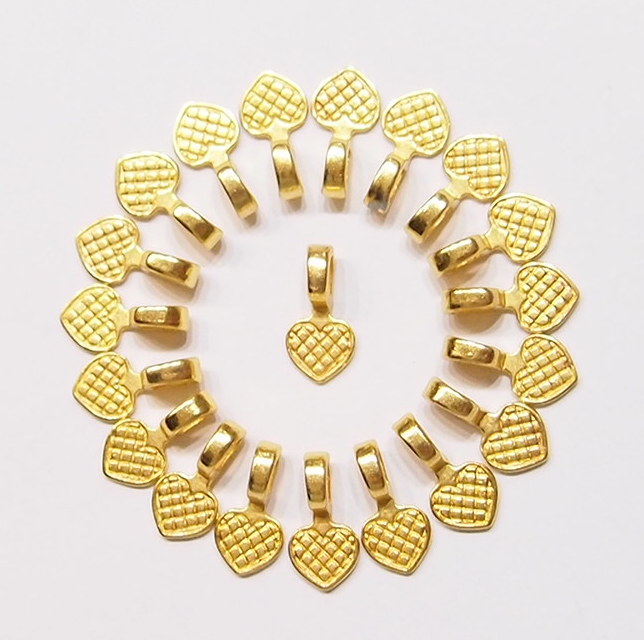 You are buying 20 Small Shiny Gold Plated Heart Shaped Glue on Bails. These measure 15 mm long x 8 wide with a nice loop, that will fit most an chain or cord. You can glue a small items such as Cameos or Cabs or Coins or even glass or bottle lids. These are exactly what you need to make anything into a pendant, glass, tiles, and cameos. These that will help you start or finish any project you have. I have lots of Great Bails, Bracelets, Cameos, Chains, Connectors, Pendants, Pins, Rings & Settings so, just look at all my listings. I also have Bails in a group of 21 with 6 Styles & Sizes & 4 Colors as shown in the last picture item #110911244722, sold separately.