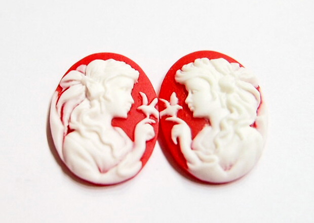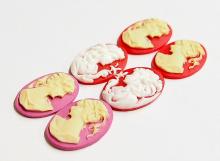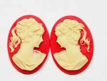 You are buying 3 Different Pairs of 25 mm x 18 Classic Woman Cameos with Ponytails, Left & Right. They are of Beautiful woman with a small wisp of hair hanging down in the back, she is the classic woman cameo, so often seen. There is a right and left facing direction so you will receive 1 left and 1 right of each of the 3 Different ones. You will receive one set of Cream over Red, White over Red, & one set of Cream over a pinkish background. They measure 25 mm x 18 mm. These are perfect, & look really nice, better than in the pictures. These would look great in earring, bracelets, pins or rings. I have lots of Great Bails, Bracelets, Cameos, Chains, Connectors, Jump Rings, Lockets, Pendants, Pins, Rings & Settings so, just look at all my listings. All of these are offered in groups of 6 with 3 left & 3 right. The cream over red is item #110911242465, the white over red with bird is item #111192354538, and the cream over pink is item #360471675590.