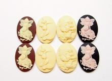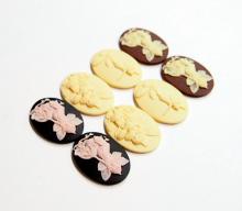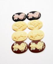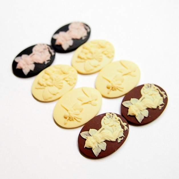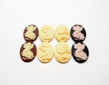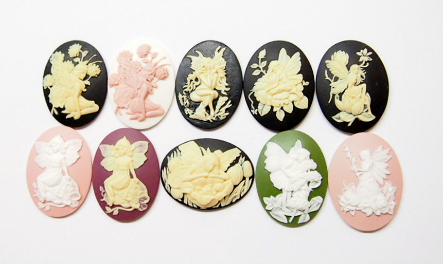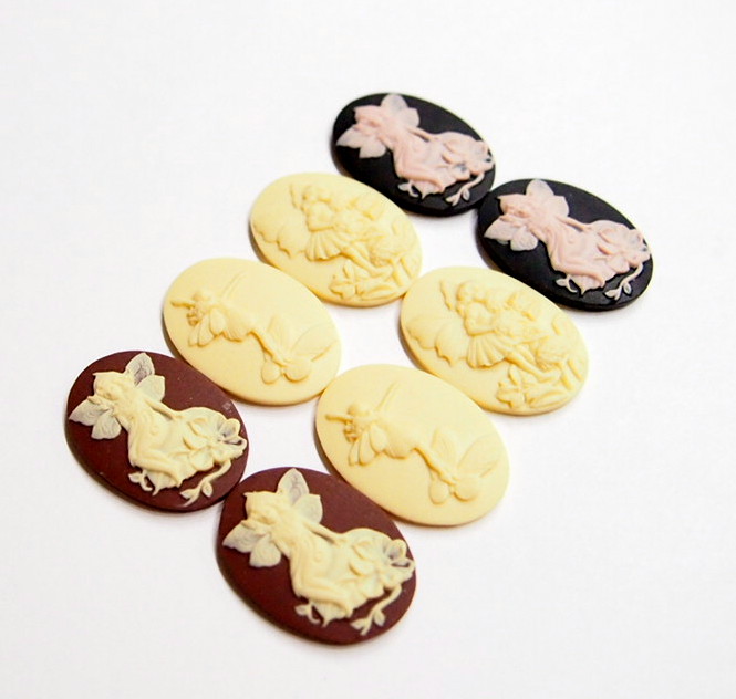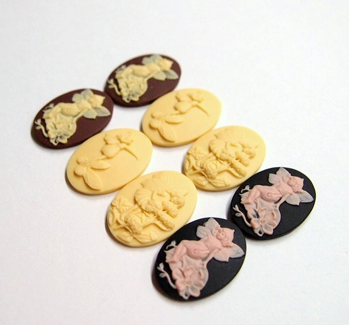 You are buying 3 different Colors of 25 mm x 18 mm cute Fairy Cameos in 4 different poses, 8 Total. You will receive 2 each Cream over Brown, 2 each of a Fairy standing in the flowers cream over cream & 2 of a Fairy with arms spread cream over cream also standing on flowers & 2 each Pink over Black gorgeous fairy Cameos. The middle two that are cream over cream can be painted on to make them your own. The images stand out from the cameos to give them all the 3-d effect. They all measure 25 mm x 18 mm. They all look very detailed for their size. I have lots of Great Bails, Bracelets, Cameos, Chains, Connectors, Jump Rings, Lockets, Pendants, Pins, Rings & Settings so, just look at all my listings. All of these are offered in groups of 6 of each Color. The cream over brown is item #360480120276, the cream color fairy standing on a butterfly is item #464172264213, the next cream color fairy is standing in flowers item # 096325295338, and the pink over black fairy sitting on a leaf is item #110934851566, all sold separately. I also have several Colors in 40x30 mm as shown in the next to last picture item #360471675934, sold separately. Also offered is a group of 18 different Fairy Glass Cameos as shown in the last picture item #111210026164, sold separately & the same group is offered in 40x30 mm item #111563956363.