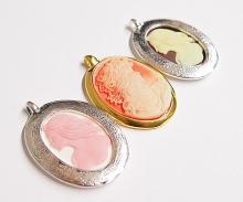 You are buying 3 different Colors of 38 mm x 28 mm Single Band Pendant Settings with unset Cameos included. You will receive one each Gold, Antique Silver & Silver, these are all Plated settings & included are 2 left facing with flowing hair (one Pink over White & one Cream over Brown) Cameos & one Right Facing White that fades into orange Wispy Hair lady Cameo. These settings are originally from the 1900-1930's, I only had a few left and found a company to make these for me and they are gorgeous. These have a nice sturdy 3 mm loop at the top that will fit most any chain or cord. They are very solid, not flimsy like the new ones are. You will not be disappointed in the quality, it is excellent and if I was setting any cameos or cabochons, I would use these. The unusual & great thing about these settings is that you can use them on either side. These are for all the odd size cameos or cabochons as they are a little under the standard 40x30 mm. These will work great for any cameos or cabs, they will have to be glued in. I have lots of Great Bails, Bracelets, Cameos, Chains, Connectors, Pendants, Pins, Rings & Settings so, just look at all my listings. All of these are offered in groups of 4 of each Color. The Gold is item #110911243395, the Antique Silver item #360471675967, and the Silver is item #110911244742, these are all plated and sold separately. I also have the 2 Flowing hair Cameos in 25x18 mm. All you need for these to be ready to wear would be a little glue & a chain which I have 4 Colors & 2 Styles of. The Cameos included in this listing are offered in groups. The pink over white is item #110911242413 and the cream over brown item #512334511657, and the ivory over orange is item #215944979329.