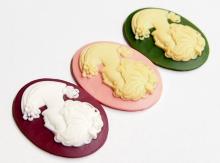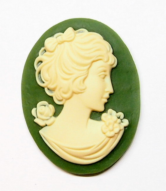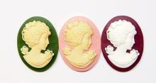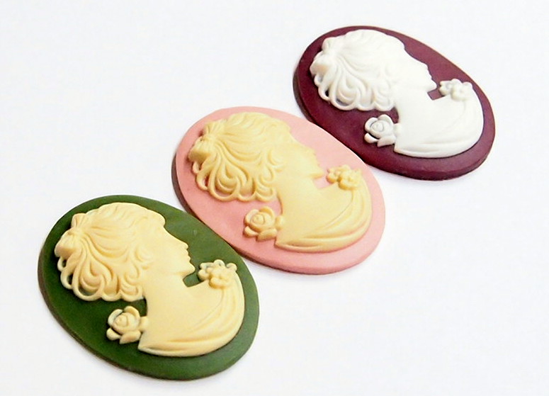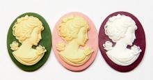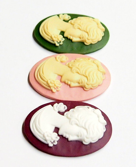 You are buying 3 different Colors 40 mm x 30 mm Beautiful Lady in Shy Pose Cameos. You will receive one each of Cream over Green, Cream over Pink, & one White over Plum Color. These are so gorgeous, this shows a beautiful Victorian young woman in a Shy Pose with a Corsage & her hair up. These measure 40 mm x 30 mm. The molding process of these are just great, no flaws. I have several different settings these will fit in. These are pretty fabulous. They look very detailed for their size. I have lots of Great Bails, Bracelets, Cameos, Chains, Connectors, Jump Rings, Lockets, Pendants, Pins, Rings & Settings so, just look at all my listings. All of these are offered in groups of 4 of each Color and are sold separately. The cream over green is item #110911248586, cream over pink item #360471677832, and the white over plum is item #110911244728. These are also offered in a group of 6 different colors as shown in the last picture Item # 2914060384321, sold seperatly. I also have these in 25x18 mm.