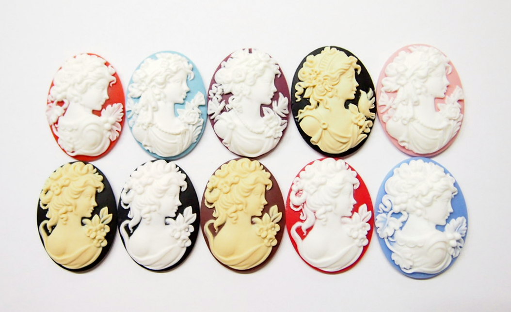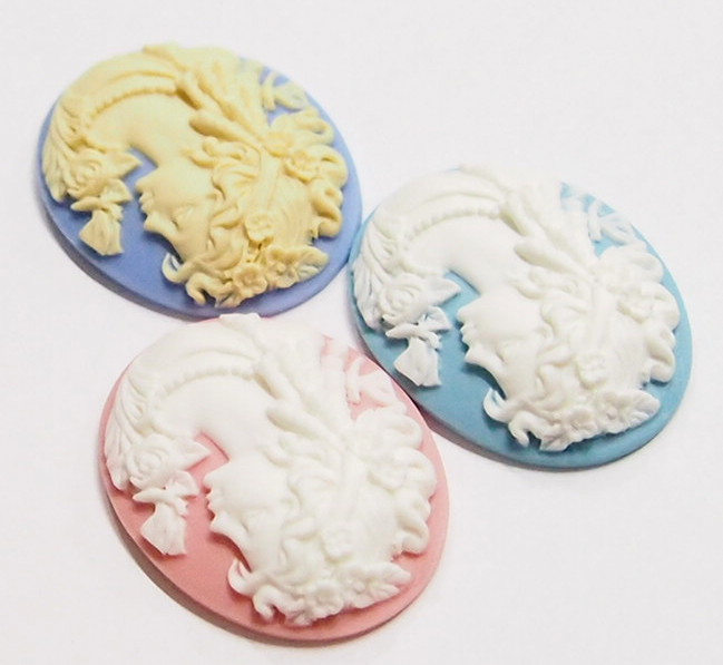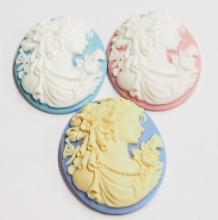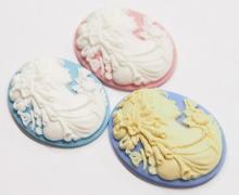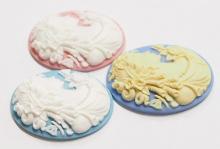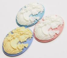You are buying 3 different Colors of 40 mm x 30 mm Grecian Muse with Butterflies Cameos. You will receive 1 each of White over Aqua Blue, 1 of White over Pink, & 1 of Cream over Blue. These are so gorgeous, this shows a beautiful Mythology Muse or Grecian woman in a gown with her hair up and her hairband is all floral with roses and there are dragonflies or butterflies on each side of her. She is wearing a pearl necklace and her gown has a floral accent too, they are perfect. The molding process of these are just great, no flaws. I have several different settings these will fit in. These are pretty fabulous. The details are very sharp and stand away from the background, giving it a 3-D effect. I have lots of Great Bails, Bracelets, Cameos, Chains, Connectors, Jump Rings, Lockets, Pendants, Pins, Rings & Settings so, just look at all my listings. All of these are offered in groups of 4 of each Color. The white over aqua blue is item #110911242397, the white over pink is item #110911242404, and the cream over blue is item #360576468063. Two of these (the white over blue and the white over pink) are also offered in a group of 10 different Colors of Muses Graces as shown in the last picture item #111589921829, sold separately.