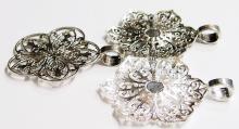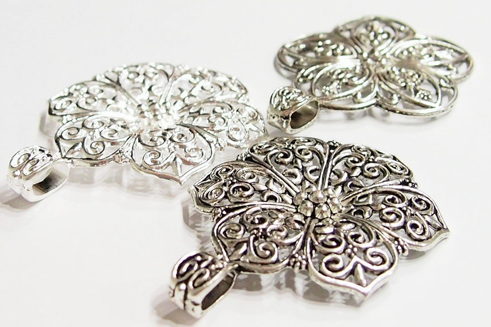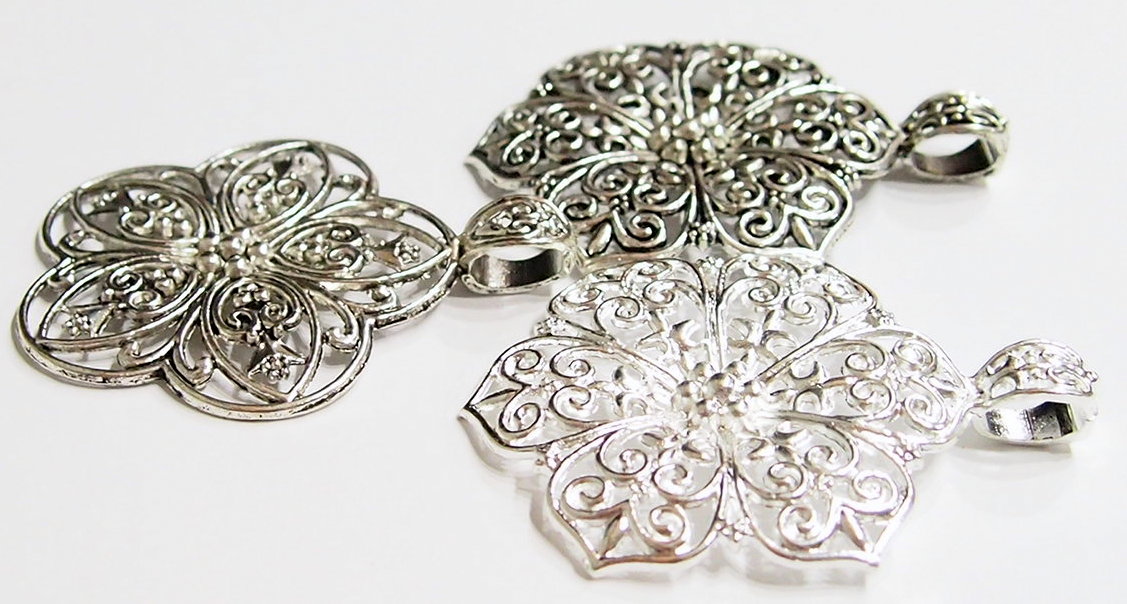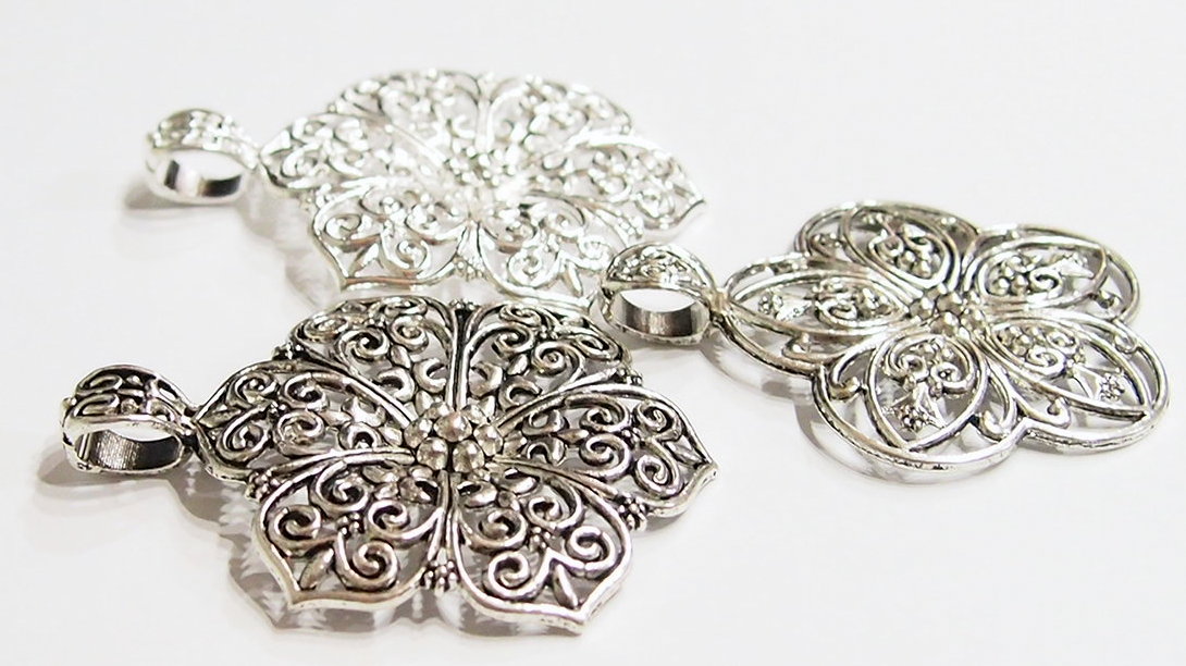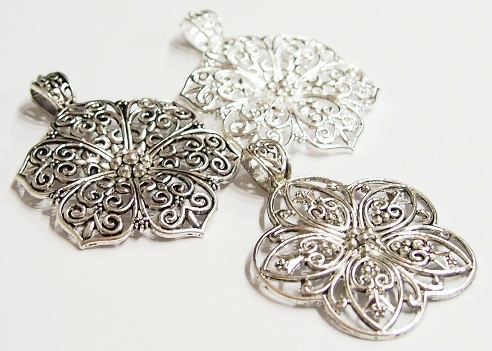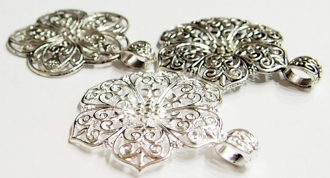 You are buying 3 Leaf & Floral with a large Bail Plated Pendants, these are very pretty. The two big ones (one is Antique Silver & the other one is Shiny Silver Plated) measure 72 mm x 52 mm & the smaller one which is Antique Silver measures 66 mm x 53 mm. These are all very sturdy, plus the detail on these is great. The two biggest ones are in a shape of a 6 sided flower & the one smaller one has a 5 sided floral look to it & they all have a very large bail made into the top. They are great quality. These are ready to wear. I have lots of Great Bails, Bracelets, Cameos, Chains, Connectors, Jump Rings, Lockets, Pendants, Pins, Rings & Settings so, just look at all my listings. These are all available in groups of two of each. I have lots of other plated pendants in several sizes & Colors.