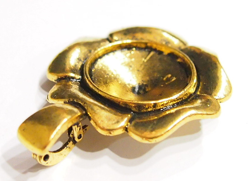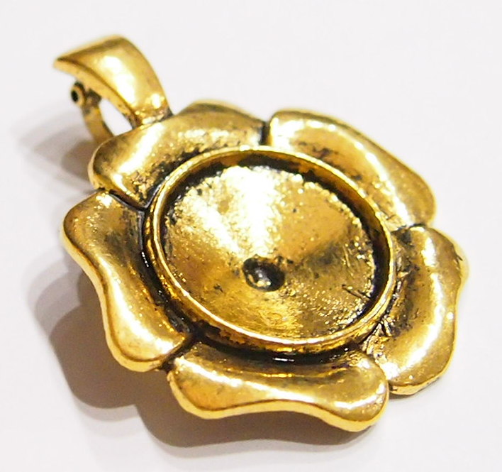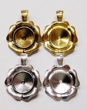 You are buying 4 of 20 mm Round Antique Gold Plated Enhancer Flower Pendant Settings, these fit 20 mm cabs or cameos. These are very sturdy. They are in the shape of a flower and they have the bonus Enhancer Bail, so you can put these over an existing necklace. They are great quality, not like a lot of the ones listed on other sites because I had these made. Cabs or Cameos will have to be glued in, no prongs. I have lots of Great Bails, Bracelets, Cameos, Chains, Connectors, Jump Rings, Lockets, Pendants, Pins, Rings & Settings so, just look at all my listings. I have these in 3 other Colors & in a group of 4 Colors as shown in the last picture item #360956137703. I have several other round settings in lots of Colors & sizes.