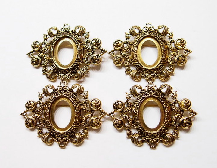 You are buying 4 of 25 mm x 18 mm Antique Gold Ornamental Hearts Art Deco Brooch Pin or Pendant Settings. The outer dimensions are 62 mm x 47 mm. These settings are originally from the 1900-1930's, I only had a few left and found a company to make these for me and they are gorgeous. These have a pin & latch on the back. These have Hearts at the top & bottom so you could put a chain through or Jump Ring (which I have 3 Colors & 2 Sizes of) & make this a pendant & use the bottom as a connector to embellish this gorgeous pin. The design is just delicate, but they are very solid, not flimsy like the new ones are. You will not be disappointed in the quality, it is excellent and if I was setting any cameos or cabs, I would use these. These will work great for anything you want to set in them, they will have to be glued in. I have lots of Great Bails, Bracelets, Cameos, Chains, Connectors, Jump Rings, Lockets, Pendants, Pins, Rings & Settings so, just look at all my listings. I have these in 3 other colors and in a group of 4 colors as shown in the last picture item #363358299271, sold separately. I have pin settings a lot like these in 4 Colors & 2 Styles in 18x13 mm.