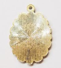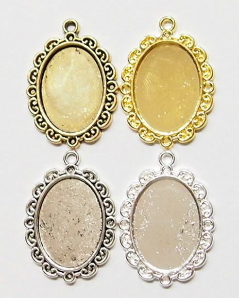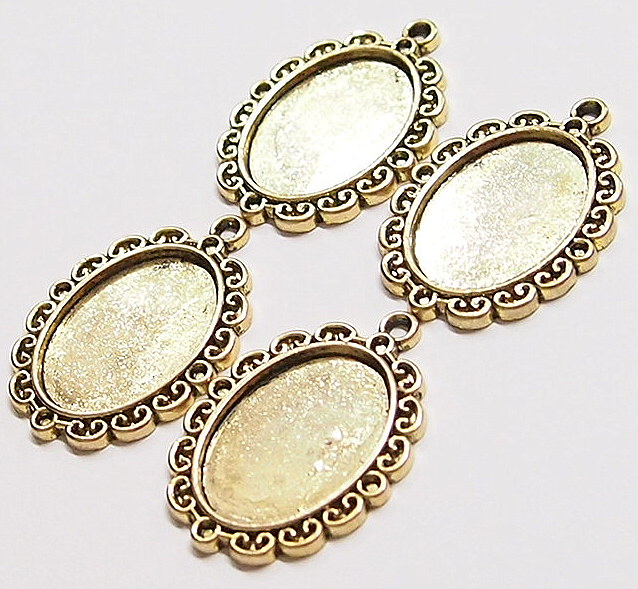 You are buying 4 of 25 mm x 18 mm Antique Gold Plated Oval Scalloped Flower Design Pendant Settings. They have a scalloped Flowered Design around the edge of the pendant setting. The top has a nice size loop (2.6 mm) for your Chain or Cord or Jump Ring (which I have 3 Colors & 2 Sizes of). These are Glue in settings and are very sturdy. There is a place to add a small crystals at the top & bottom or just leave them blank, as they look just fine the way they are. These have never been used. Since they are a solid back, you could go down in size a little if you had an odd size cameo or cabochon to try & fit. Everything is solidly made from the setting to the pendant bail. I have lots of Great Bails, Bracelets, Cameos, Chains, Connectors, Jump Rings, Lockets, Pendants, Pins, Rings & Settings so, just look at all my listings. I have these in 3 other Colors & in a group of 4 Colors as shown in the last picture item #360805387231, sold separately.