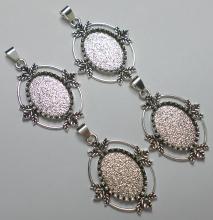You are buying 4 of 25 mm x 18 mm Antique Silver Plated Fancy Old Style Scallop & Leaf Pendant Settings. These settings are originally from the 1900-1940's, I only had a few left and found a company to make these for me and they are gorgeous. These have a nice bail and are glue in settings. The design is just delicate and fancy, but they are very solid, better than the old ones, with a scallop edge around the settings and a 4 leaf design. You will not be disappointed in the quality, it is excellent and if I was setting any cameos, cabochons, glass, or whatever you want, I would use these. Since they are a solid back, you could go down in size a little if you had an odd size cameo or cabochon to try & fit. I have lots of Great Bails, Bracelets, Cameos, Chains, Connectors, Jump Rings, Lockets, Pendants, Pins, Rings & Settings so, just look at all my listings. These are just a little fancier than the others and look almost exactly like the old style item #360483151111, as shown in the next to last picture. I have these in 3 other Colors and in a group of 4 Colors as shown in the last picture item #111304415405, sold separately. I also have these in 40x30 mm item #111368096852.