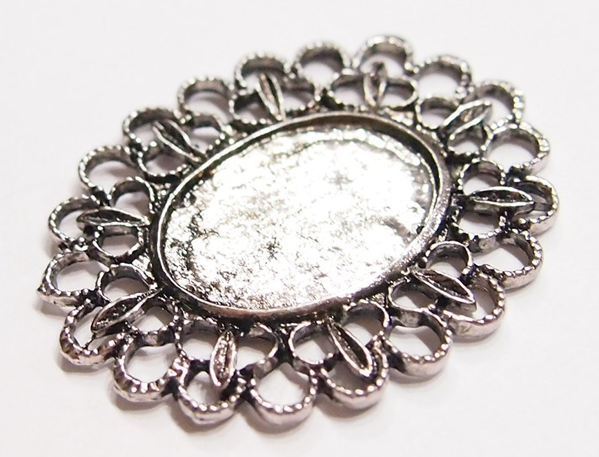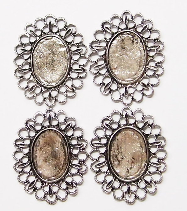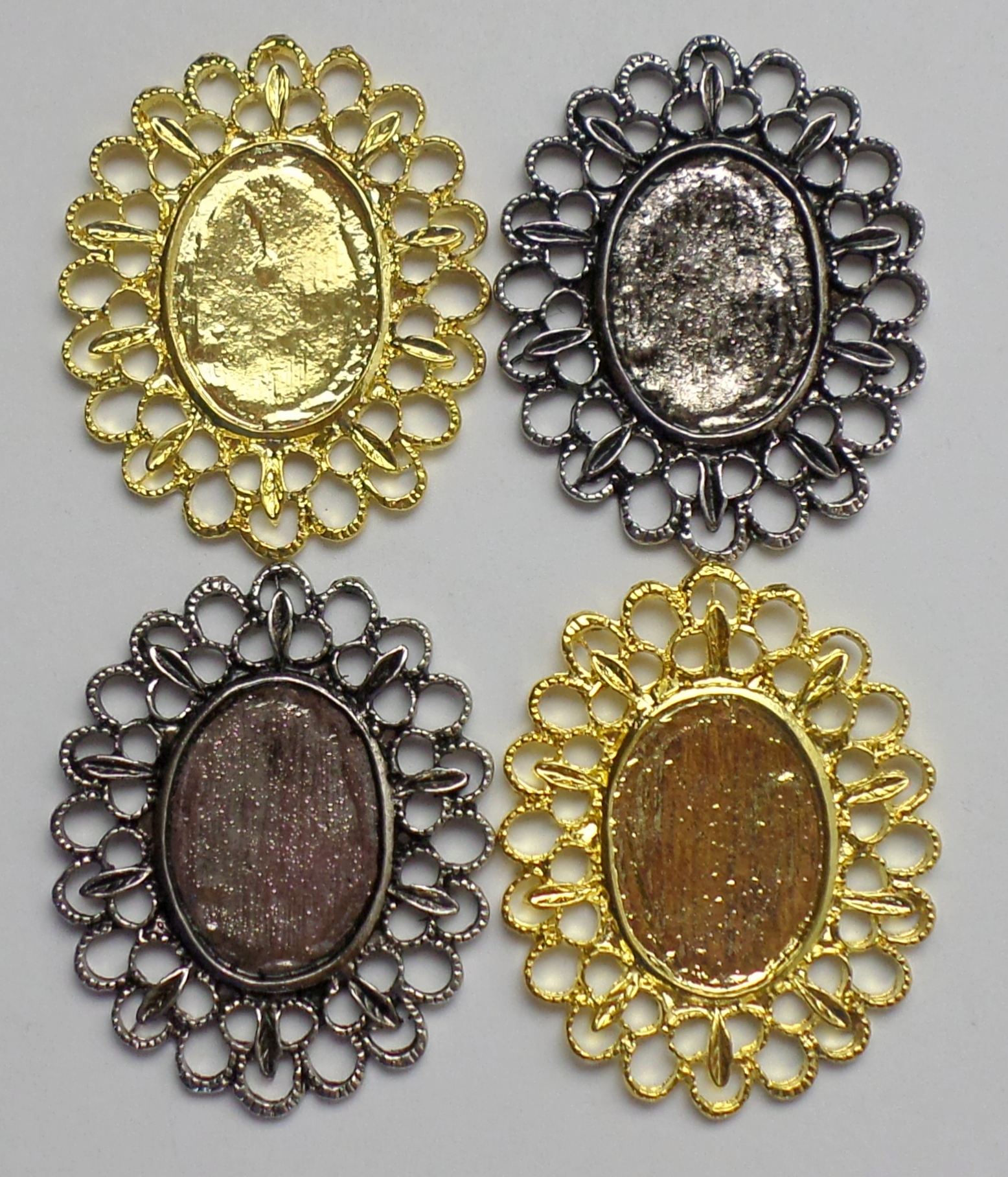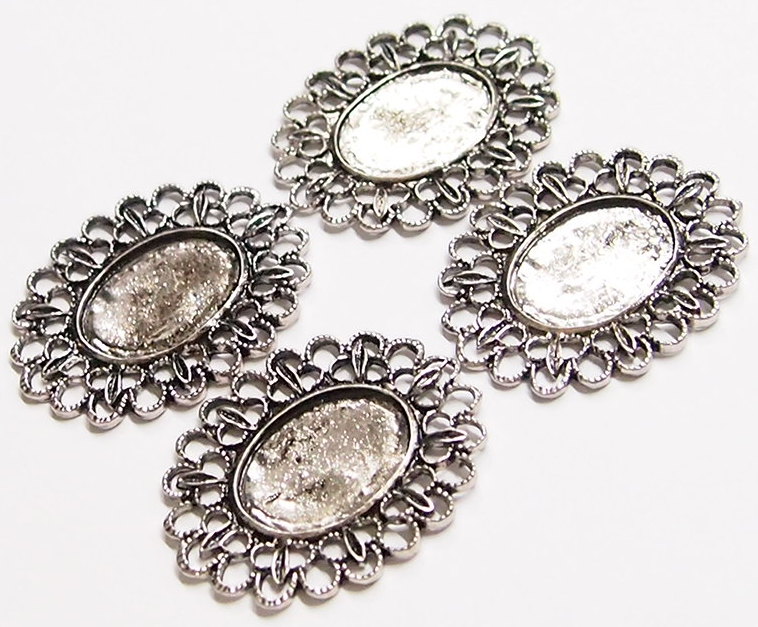You are buying 4 of 25 mm x 18 mm Antique Silver Plated Loops & Leaves Pendant Settings, outside dimensions are 46 x 36 mm. You can use these either Horizontal or Vertical. You will have to glue in any cameos or cabochons you want to put into the settings, no prongs and they are very sturdy. The design is very pretty with a large scalloped looped edge all around and single leaves running through the pattern. You can put a jump ring either on top or on the sides to make this pendant horizontal or vertical. There is no pendant bail, but a jump ring works perfect, that is what I have used before, or a pinch bail. These have never been used. These are exactly made for 25 mm x 18 mm, but with this being a solid backing, you can go down a little on the size is you have an odd size Cameo or Cabochon to try and fit. Everything is solidly made. They have a gorgeous Victorian look to them. I have lots of Great Bails, Bracelets, Cameos, Chains, Connectors, Jump Rings, Lockets, Pendants, Pins, Rings & Settings so, just look at all my listings. I have these in 1 other Color (shiny Gold) item #360478420832 as shown in the next to last picture, sold separately & in a group of both Colors as shown in the last picture item #172085325544, sold separately.