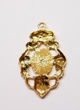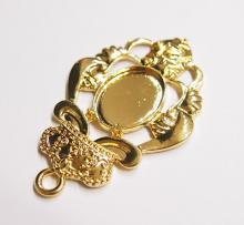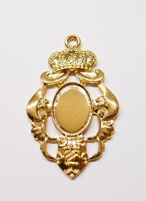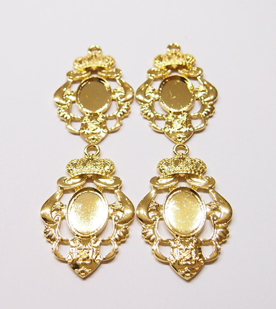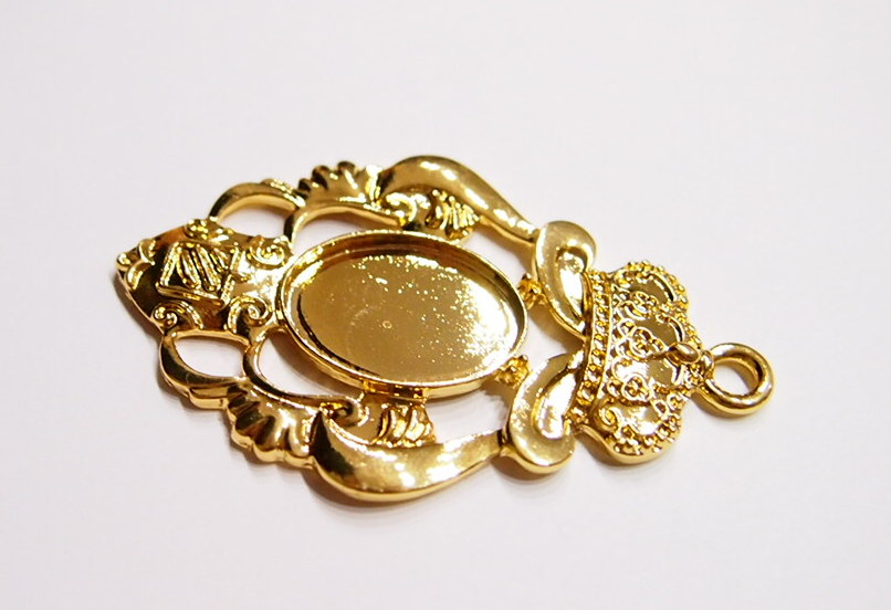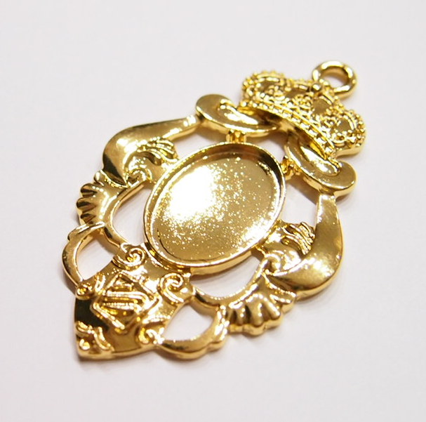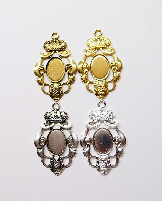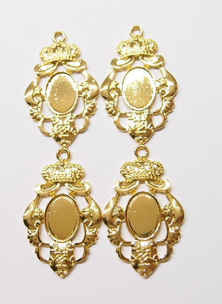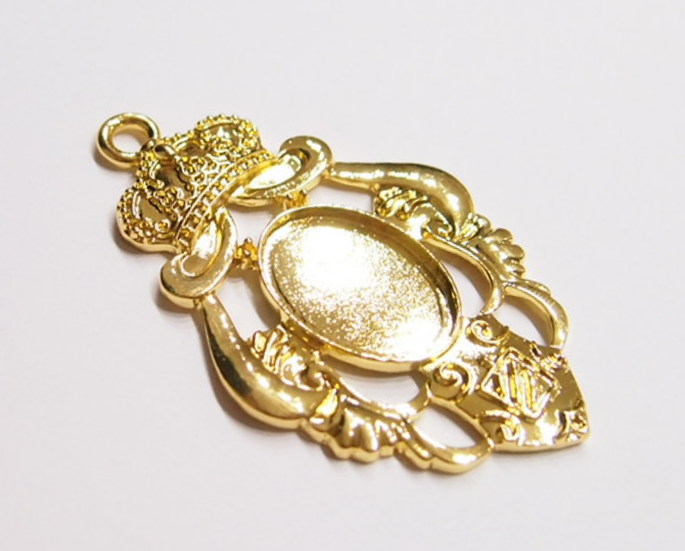 You are buying 4 of 25 mm x 18 mm Gold Plated Crown & Crest Pendant Settings. These settings are originally from the 1900-1930's, I only had a few left and found a company to make these for me and they are gorgeous. The design is just delicate, but they are very solid, not flimsy like the new ones are. These have a Great Crown & Crest made into them. The outer dimensions are 71 mm including the loop x 44 mm. The top has a nice size loop (4.4 mm) for your Chain or Cord or Jump Ring (which I have 3 Colors & 2 Sizes of). These are lightweight but sturdy. You will not be disappointed in the quality, it is excellent and if I was setting any cameos or cabs, I would use these. These will work great for any cameos or cabs, they will have to be glued in. I have lots of Great Bails, Bracelets, Cameos, Chains, Connectors, Jump Rings, Lockets, Pendants, Pins, Rings & Settings so, just look at all my listings. I have these in 3 other Colors & in a group of 4 Colors as shown in the last picture item #110911243348, sold separately.