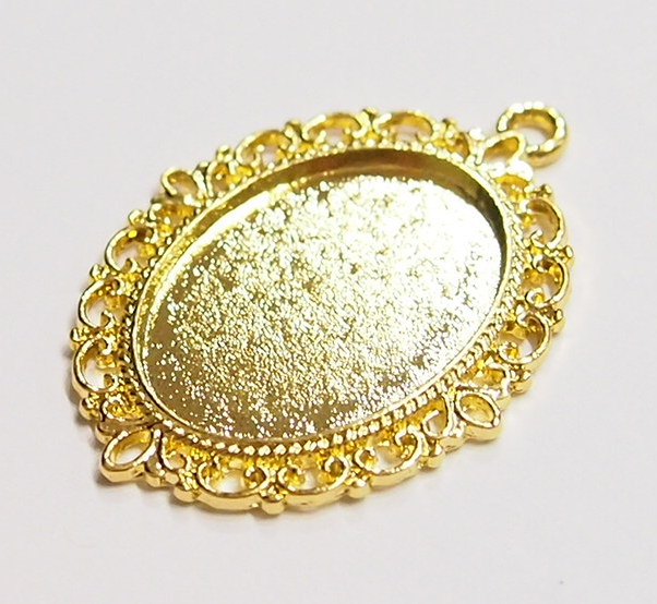 You are buying 4 of 25 mm x 18 mm Shiny Gold Plated 4 Loops Scalloped Edged Pendant Settings. The design is very pretty with a scalloped edge all around and the back has a basket weave pattern on it. The outside dimensions are 38x28 mm including the loop at the top. The top has a nice size loop (2.2 mm) for your Chain or Jump Ring (which I have 3 Colors & 2 Sizes of). You will have to glue in any cameos or cabochons you want to put into the settings, no prongs and they are very sturdy. The biggest size that will fit in these are 25 mm x 18 mm. Since they are a solid back, you could go down in size a little if you had an odd size cameo or cab to try & fit. They have never been used, very nice looking. I have lots of Great Bails, Bracelets, Cameos, Chains, Connectors, Jump Rings, Lockets, Pendants, Pins, Rings & Settings so, just look at all my listings. I have these in 3 other Colors & in a group of 4 Colors as shown in the last picture item #111393683277, sold separately.
