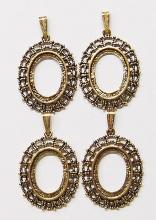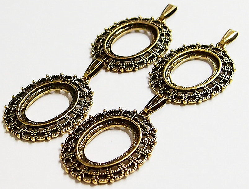 You are buying 4 of 25 mm x 18 mm Oval Antique Gold Plated Lacy Pendant Settings. The pendant comes down from the bail into a gorgeous woven pattern that flares out from where the cameos or cabochons will be set and will accent anything you put in them. These are exactly made for 25 mm x 18 mm, no other size will fit. They have a gorgeous Victorian look to them. You will not be disappointed in the quality, it is excellent and if I was setting any cameos or cabochons, I would use these. These are lightweight & sturdy. I have lots of Great Bails, Bracelets, Cameos, Chains, Connectors, Jump Rings, Lockets, Pendants, Pins, Rings & Settings so, just look at all my listings. I have these in 3 other Colors & in a group of 4 Colors as shown in the last picture item #111371045806, sold separately. I also have these in 40x30 mm item #111392559827.