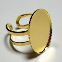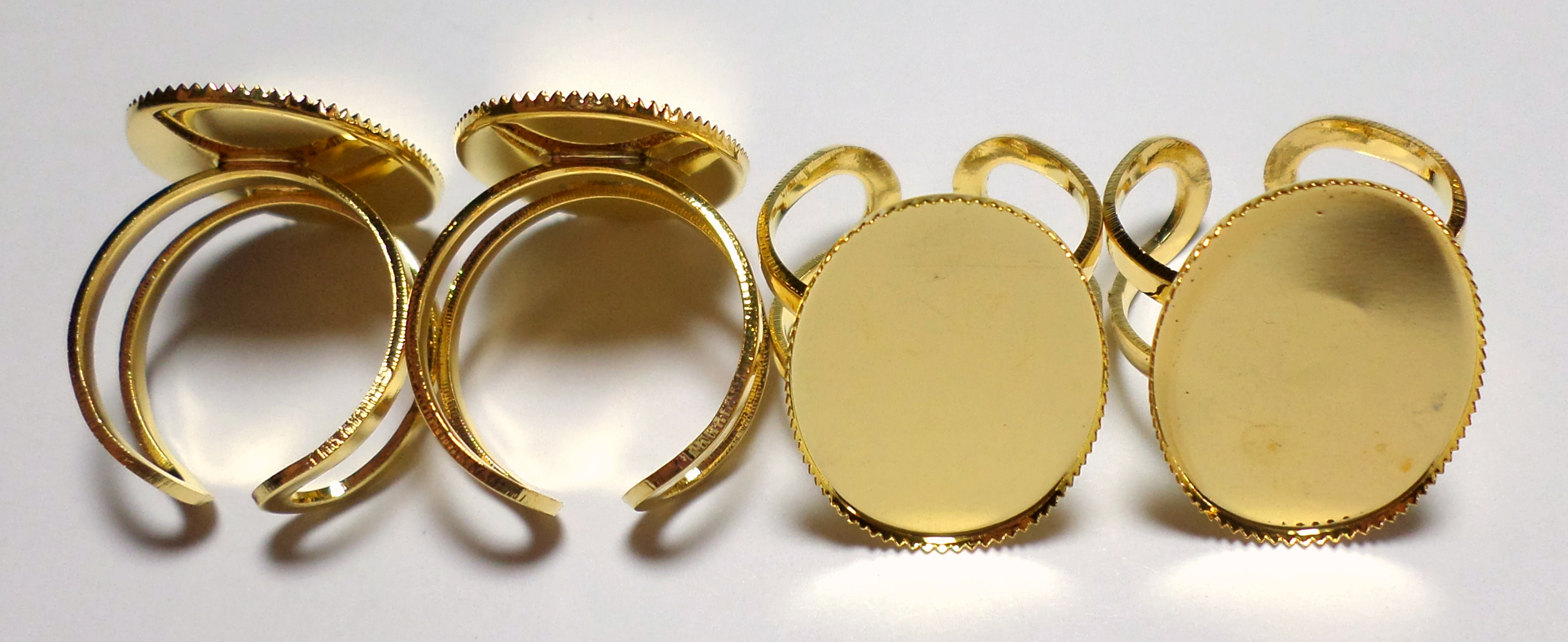 You are buying 4 of 25 mm x 18 mm Shiny Gold Plated Modern Sturdy Adjustable Ring settings. These will work great for any cameos or cabs, and will have to be glued on. The biggest size that will fit in these are 25x18 mm. Since they are a solid back, you could go down in size a little if you had an odd size cameo or cab to try & fit. These are adjustable from size 7-15. These are lightweight and sturdy. I have lots of Great Bails, Bracelets, Cameos, Chains, Connectors, Jump Rings, Lockets, Pendants, Pins, Rings & Settings so, just look at all my listings. These are also offered in a group of 4 Colors as shown in the last 2 pictures item #112413920473. I also offer 3 other Colors of these in groups of 4 each. The Antique Gold is item #112415990159, Antique Silver is item #361986859792 and the Shiny Silver is item #361987279645. I also have many other styles and sizes of rings so, look at all my listings.