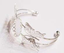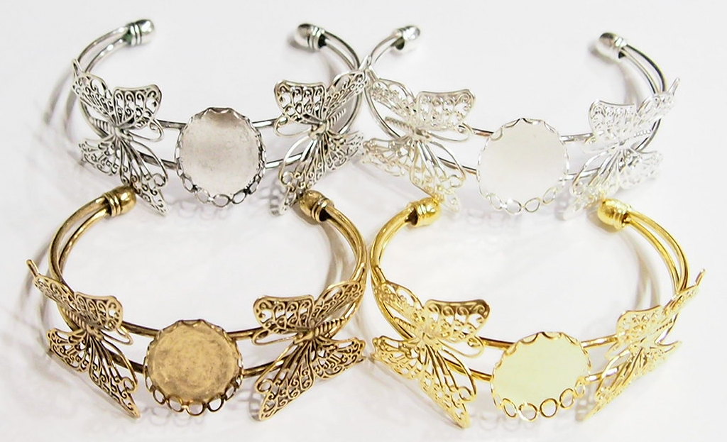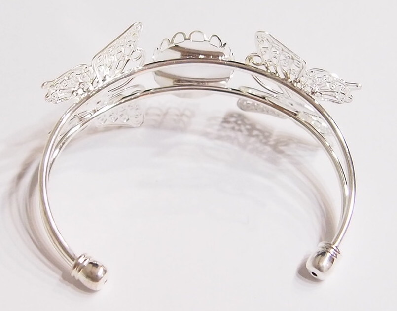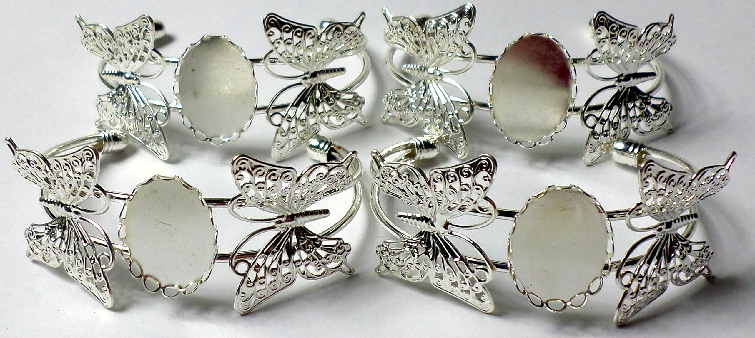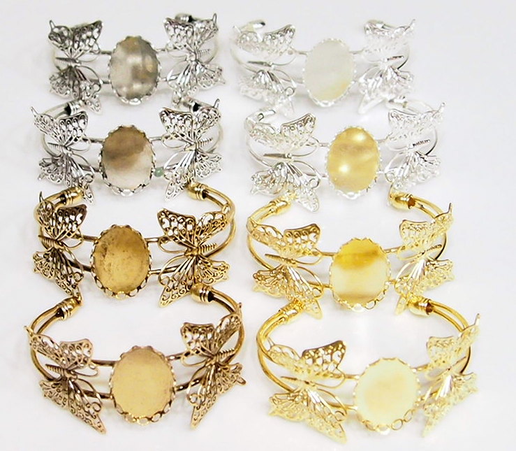 You are buying 4 of 25 mm x 18 mm Shiny Silver Plated Cuff Bracelet Settings, you can use these for Cameos or Cabochons. You will not be disappointed in the quality, it is excellent and if I was setting any cameos or cabs, I would use these. These are vintage reproductions and are brand new. These are very sturdy and cameos or cabs can be glued in or use the tangs around the bezel to hold whatever your setting in these. These would make anything look classy. The biggest size that will fit in these are 25 mm x 18 mm. Since they have a solid back, you can go down on the size some if you had an odd size cameo or cab to try & fit. I have lots of Great Bails, Bracelets, Cameos, Chains, Connectors, Jump Rings, Lockets, Pendants, Pins, Rings & Settings so, just look at all my listings. I have these in 3 other Colors & in a group of 4 Colors as shown in the third from last picture item #110911242469, sold separately. These are also offered in a group of 2 of each of 4 Colors for a total of 8 of these Gorgeous Butterfly Cuff Bracelet Settings as shown in the next to last picture item #360760726827, sold separately. These are also offered in a group of 8 as shown in the last picture item #360643372997, sold separately.