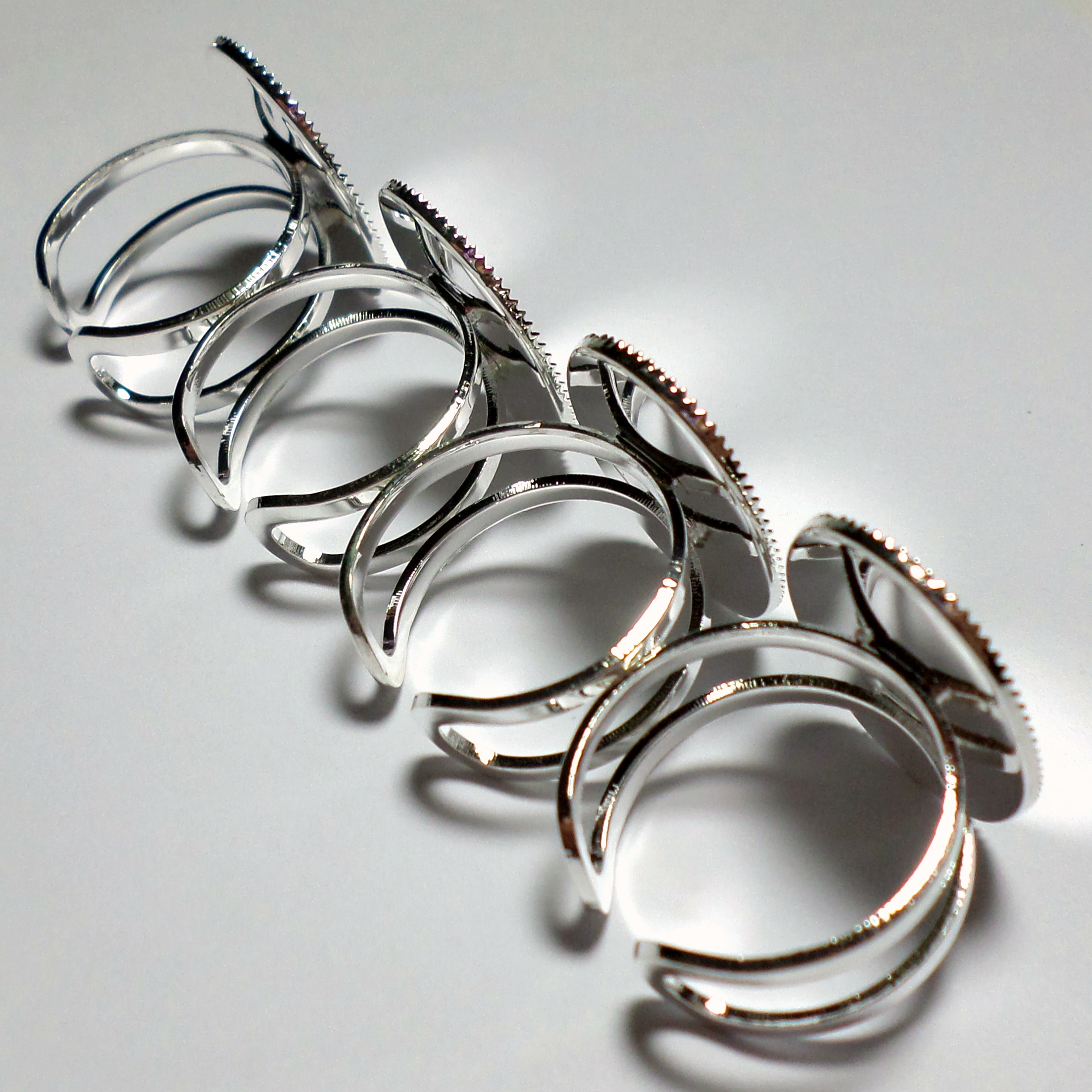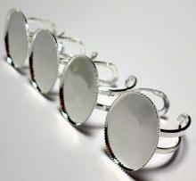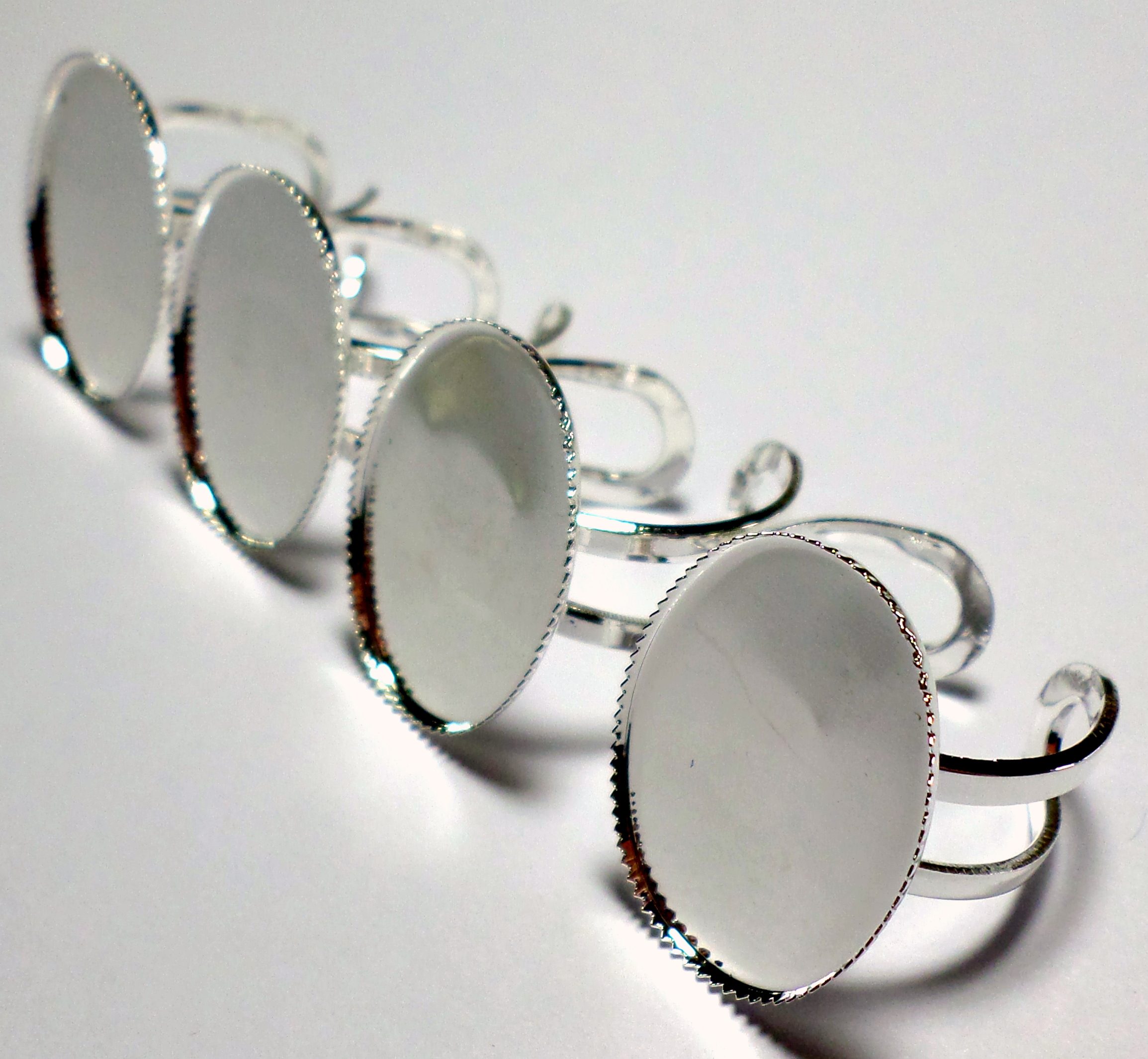 You are buying 4 of 25 mm x 18 mm Shiny Silver Plated Modern Sturdy Adjustable Ring settings. These will work great for any cameos or cabs, and will have to be glued on. The biggest size that will fit in these are 25x18 mm. Since they are a solid back, you could go down in size a little if you had an odd size cameo or cab to try & fit. These are adjustable from size 7-15. These are lightweight and sturdy. I have lots of Great Bails, Bracelets, Cameos, Chains, Connectors, Jump Rings, Lockets, Pendants, Pins, Rings & Settings so, just look at all my listings. You are buying 4 of 25 mm x 18 mm Shiny Silver Plated Modern Sturdy Adjustable Ring settings. These will work great for any cameos or cabs, and will have to be glued on. The biggest size that will fit in these are 25x18 mm. Since they are a solid back, you could go down in size a little if you had an odd size cameo or cab to try & fit. These are adjustable from size 7-15. These are lightweight and sturdy. I have lots of Great Bails, Bracelets, Cameos, Chains, Connectors, Jump Rings, Lockets, Pendants, Pins, Rings & Settings so, just look at all my listings. These are also offered in a group of 4 Colors as shown in the last 2 pictures item #112413920473. I also offer 3 other Colors of these in groups of 4 each. The Antique Gold is item #112415990159, Shiny Gold is item #361988004640, Antique Silver is item #361986859792.. I also have many other styles and sizes of rings so, look at all my listings.