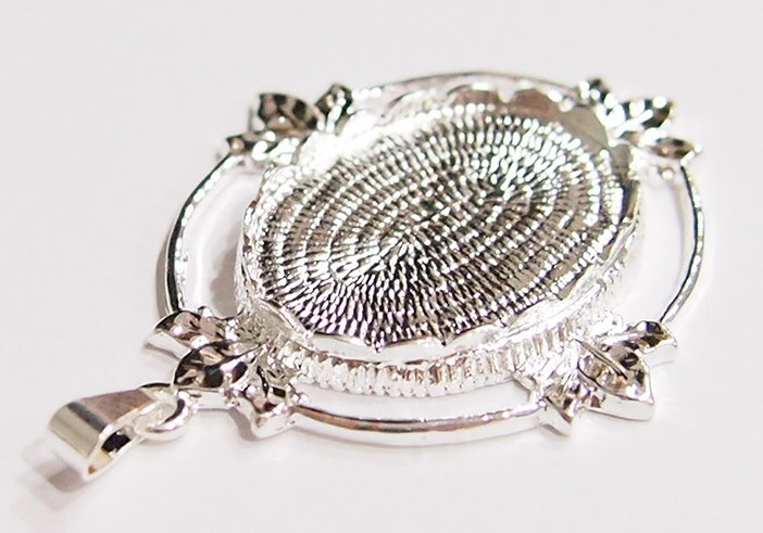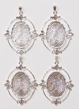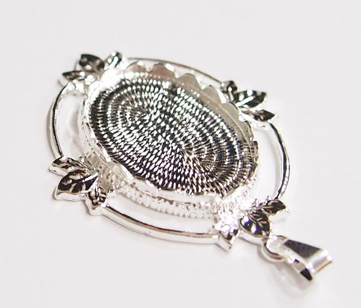 You are buying 4 of 25 mm x 18 mm Silver Plated Old Style Scallop & Leaf Pendant Settings. These settings are originally from the 1900-1940's, I only had a few left and found a company to make these for me and they are gorgeous. These have a bail and are glue in settings. The design is just delicate, but they are very solid, better than the old ones, with a scallop edge around the settings and a 4 leaf design. You will not be disappointed in the quality, it is excellent and if I was setting any cameos, cabochons, glass, or whatever you want, I would use these. Since they are a solid back, you could go down in size a little if you had an odd size cameo or cab to try & fit. I have lots of Great Bails, Bracelets, Cameos, Chains, Connectors, Jump Rings, Lockets, Pendants, Pins, Rings & Settings so, just look at all my listings. I have these in 3 other Colors & in a group of 4 Colors as shown in the last picture item #111304415405, sold separately. I also have these in 40x30 mm in 4 colors item #111368096852.