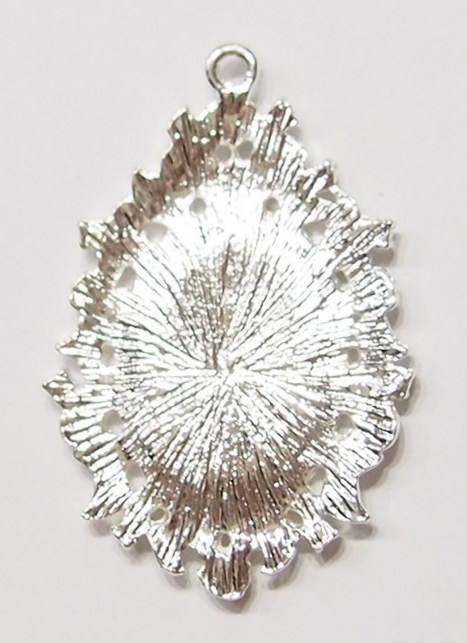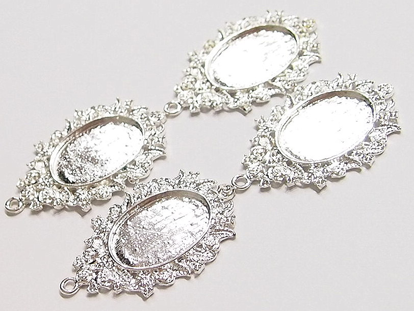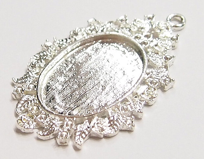 You are buying 4 of 25 mm x 18 mm Silver Plated Old Style Rose & Floral Design Pendant Settings. These settings are very pretty with a Rose & Floral design all around the edges of the setting. These settings are originally from the 1900-1930's, I only had a few left and found a company to make these for me and they are gorgeous. This measures 49x32 mm outside including the loop at the top. The top has a nice size loop (2.4 mm) for your Chain or Cord or Jump Ring (which I have 3 Colors & 2 Sizes of). There are several area you could put rhinestones, looks like pointed or flat backs will work, but you could just leave them alone, as they are fancy enough without adding anything. The design is just delicate, but they are very solid, not flimsy like the new ones are. You will not be disappointed in the quality, it is excellent and if I was setting any cameos or cabs, I would use these. These will work great for any cameos or cabs, they will have to be glued in. I have lots of Great Bails, Bracelets, Cameos, Chains, Connectors, Jump Rings, Lockets, Pendants, Pins, Rings & Settings so, just look at all my listings. I have these in 3 other Colors & in a group of 4 Colors as shown in the last picture item #360939576241. I also have these in 30x22 mm in 4 Colors with enhancer bails item #360926605856 and 40x30 mm item #360807988404 and in 4 Colors item #360471675537. I also have these in 40x30 mm Acrylic Settings in 2 Colors item #360721532480