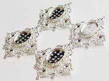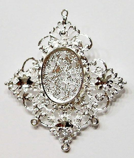 You are buying 4 of 25 mm x 18 mm Silver Old Style Victorian Flower Accents Brooch Pin or Pendant Settings. These settings are originally from the 1900-1930's, I only had a few left and found a company to make these for me and they are gorgeous. The design is just delicate, but they are very solid, not flimsy like the new ones are. There are 3 beautiful flowers, you could put stones or crystals in or leave them out, as they look great just the way they are. These measure 65x57 mm including the loops at the top & bottom. The top has a nice size loop (1.5 mm) for your Chain or Jump Ring (which I have 3 Colors & 2 Sizes of). These also have 3 connector places at the bottom so you could add something else to these if you wanted. You will not be disappointed in the quality, it is excellent and if I was setting any cameos or cabs, I would use these. These will work great for any cameos or cabs, they will have to be glued in. I have lots of Great Bails, Bracelets, Cameos, Chains, Connectors, Jump Rings, Lockets, Pendants, Pins, Rings & Settings so, just look at all my listings. I have these in 3 other Colors & in a group of 4 Colors as shown in the last 2 pictures item #360885290062.