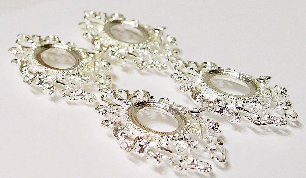 You are buying 4 of 25 mm x 18 mm Shiny Silver Plated Old Victorian Style Muse Graces Brooch Pin or Pendant Settings. The design is just delicate, but they are very solid, not flimsy like the new ones are. There are 2 Gorgeous Muses or Graces one on each side with lots of the Victorian Scroll Design, just beautiful. There is a locking latch on the pin and on the top are two holes that you could put your chain through or add a jump ring (which I have 3 Colors & 2 Sizes of) to make this gorgeous setting into a pendant as well as a brooch. You will not be disappointed in the quality, it is excellent and if I was setting any cameos or cabs, I would use these. These will work great for any cameos or cabs, they will have to be glued in. I have lots of Great Bails, Bracelets, Cameos, Chains, Connectors, Jump Rings, Lockets, Pendants, Pins, Rings & Settings so, just look at all my listings. I have these in 3 other Colors & in a group of 4 Colors as shown in the next to last picture item #360576226141. I have a new Rose Gold Color as shown in the last picture item #361313028042.